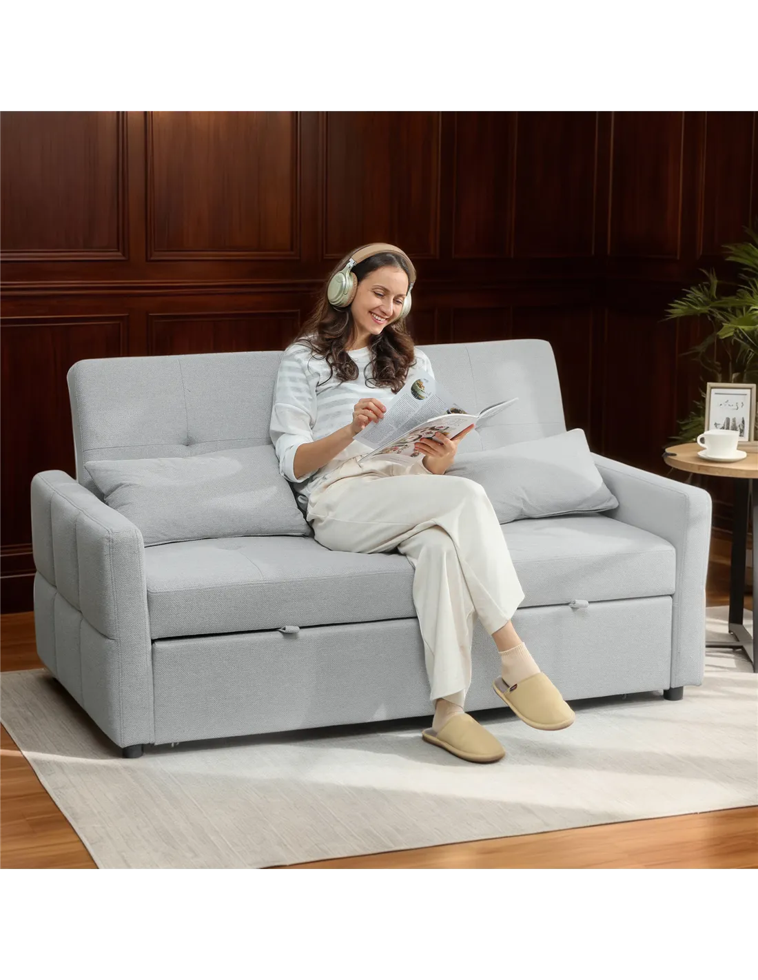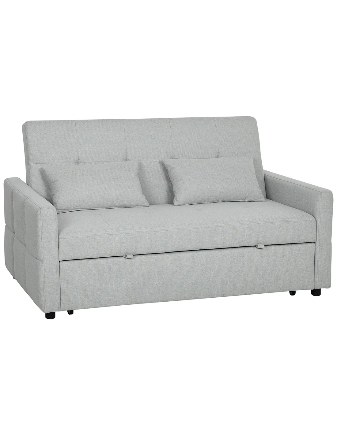 Maximise your living space with the HOMCOM Three-Way Two-Seater Sofa Bed in Light Grey. This versatile piece offers a practical solution for homes across the UK, easily transforming to suit your daily needs. Use it as a comfortable two-seater sofa, a relaxing lounger, or a convenient guest bed. Its three-part design provides exceptional flexibility. High-density foam fills the cushions, ensuring a comfortable experience and retaining shape over time. The durable linen-look upholstery adds a smooth, breathable finish to the unit. Two soft pillows provide additional comfort. Constructed with a tough wood and metal frame, and incorporating fire-retardant materials, this sofa bed provides safety and lasting use. It supports up to 220 kg. This item makes an ideal addition for any compact UK home.