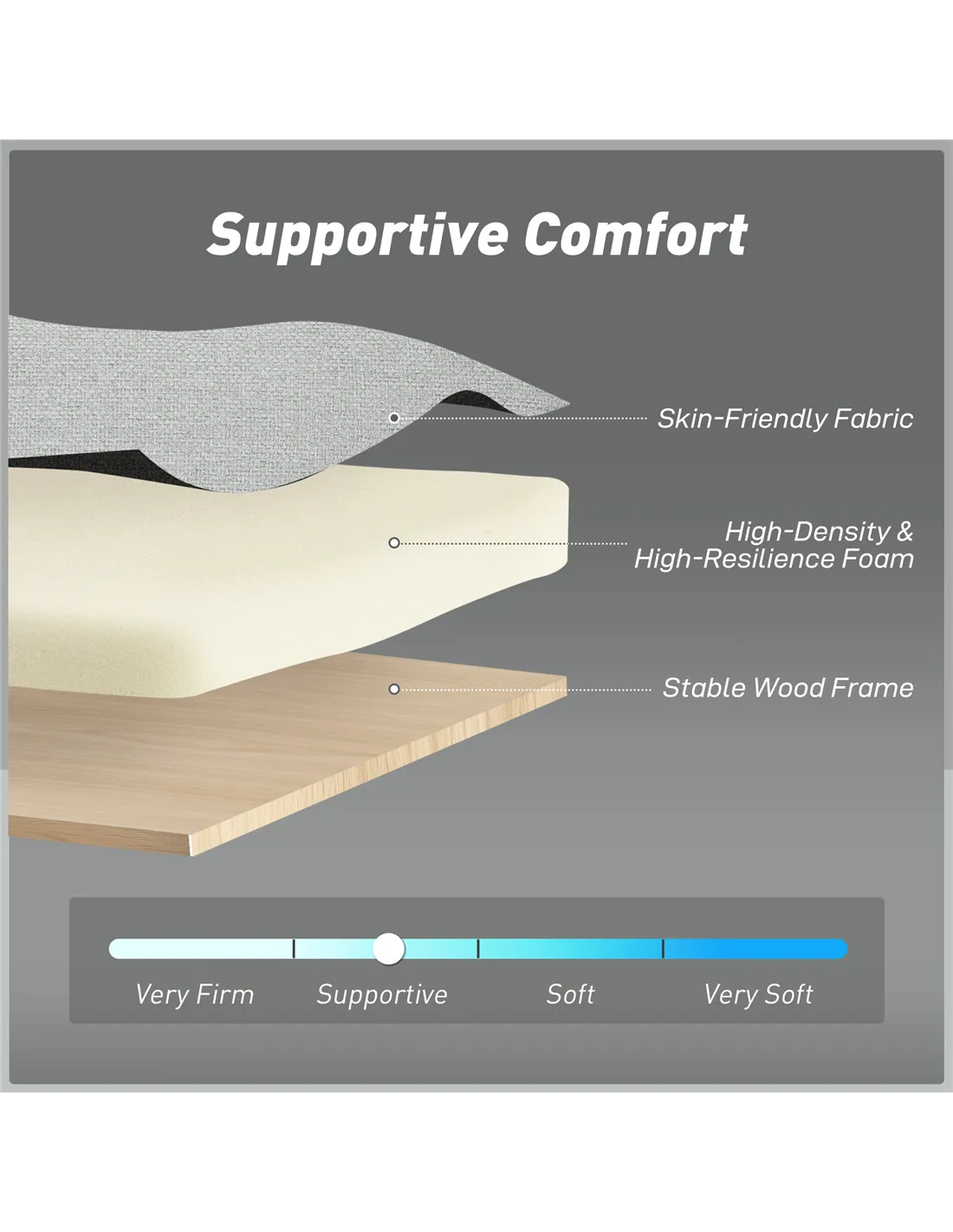 - A: The sofa bed uses linen (100% Polyester) upholstery, high-density foam padding for comfort, eucalyptus wood, and a metal frame. It includes two soft pillows for extra comfort, with removable covers for cleaning.