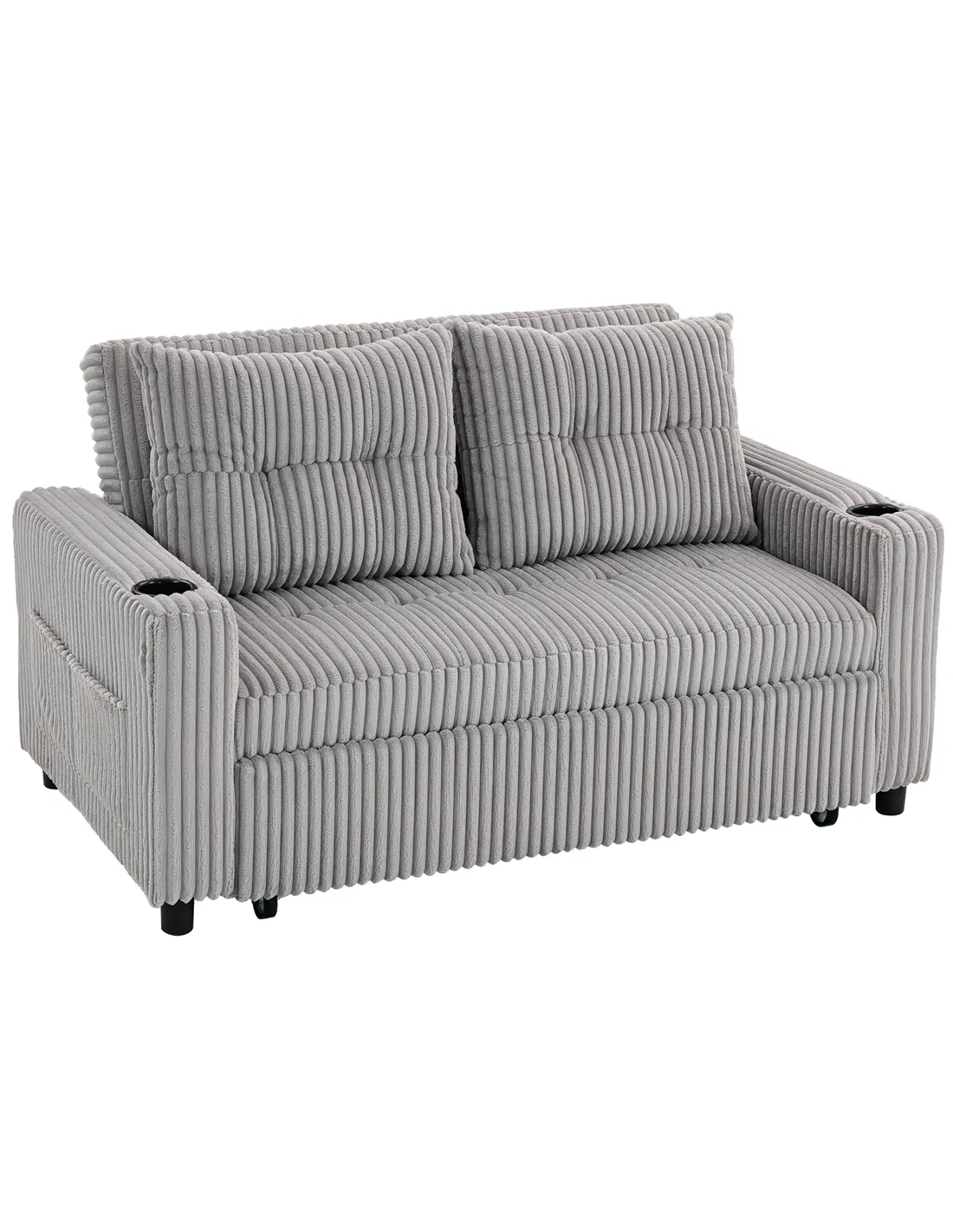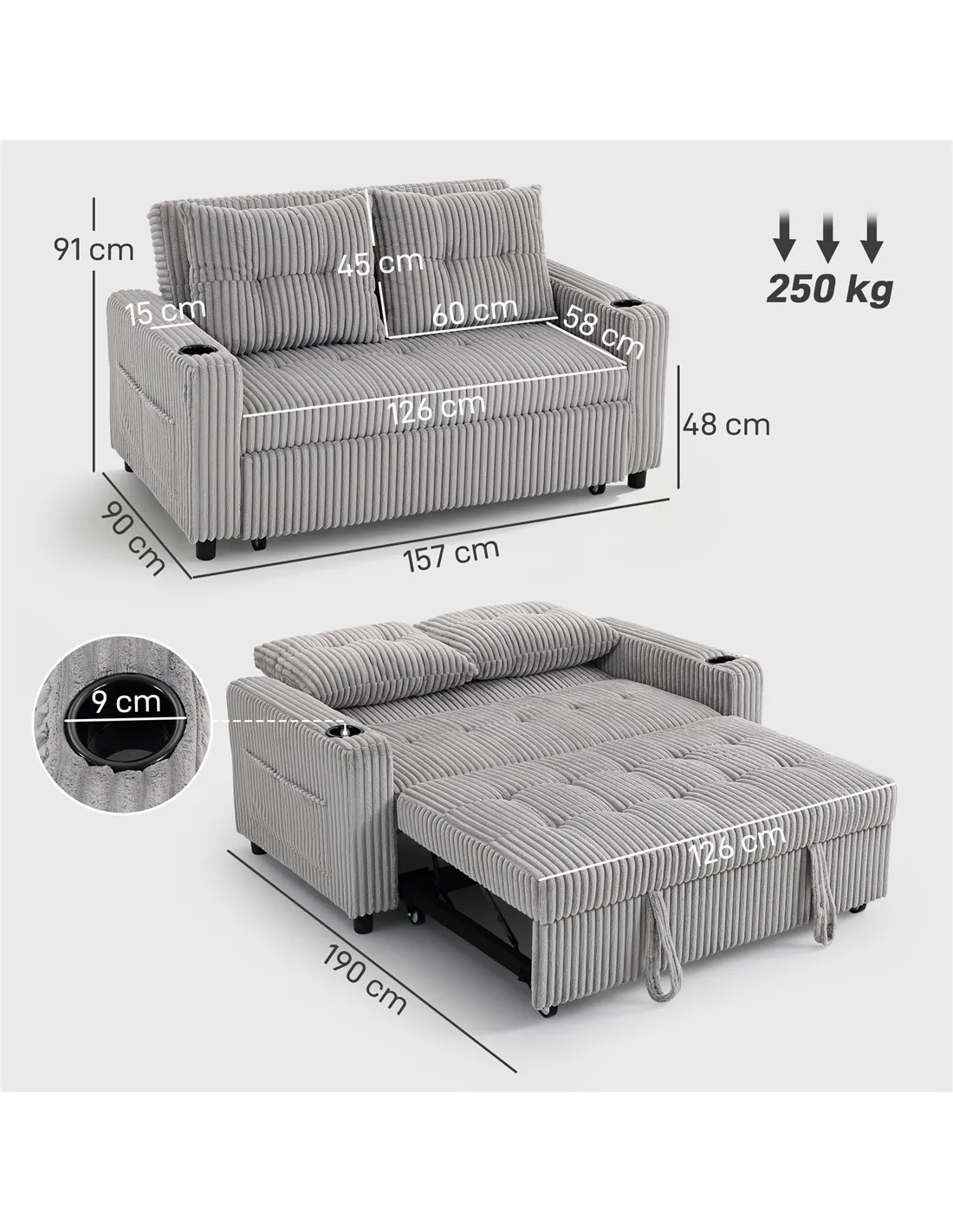 Transform your living area with the HOMCOM 2 Seater Click Clack Sofa Bed in Light Grey. This versatile furniture piece combines a comfortable 2-seater sofa with a practical pull-out guest bed. Its smart click-clack mechanism allows for effortless conversion, perfect for small UK homes. Upholstered in soft, wear-resistant corduroy, it offers a cosy, elegant feel. Enjoy personalised comfort with a three-level adjustable backrest, two integrated cup holders, and four storage pockets. Thick, high-density foam provides excellent support for both sitting and sleeping. Designed with convenience, this sofa bed ensures you are ready for unexpected guests without compromising style or space. The sturdy steel frame supports up to 250 kg. Assembly is required for setup. Fire-retardant materials enhance safety. This light grey sofa bed is a functional addition to any modern interior.