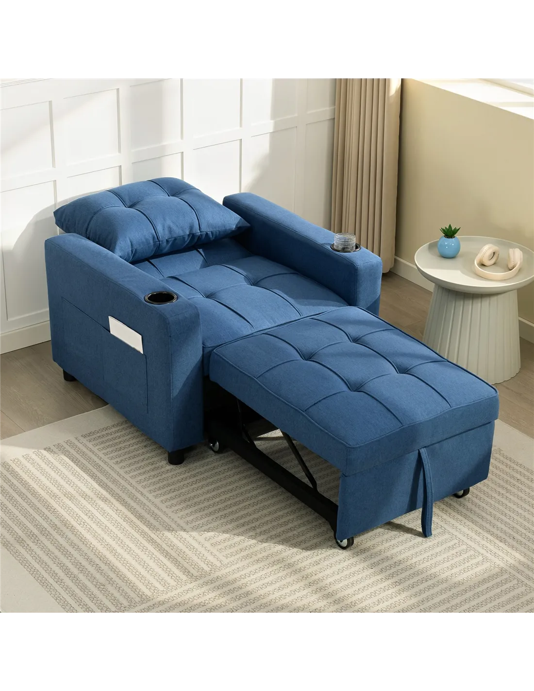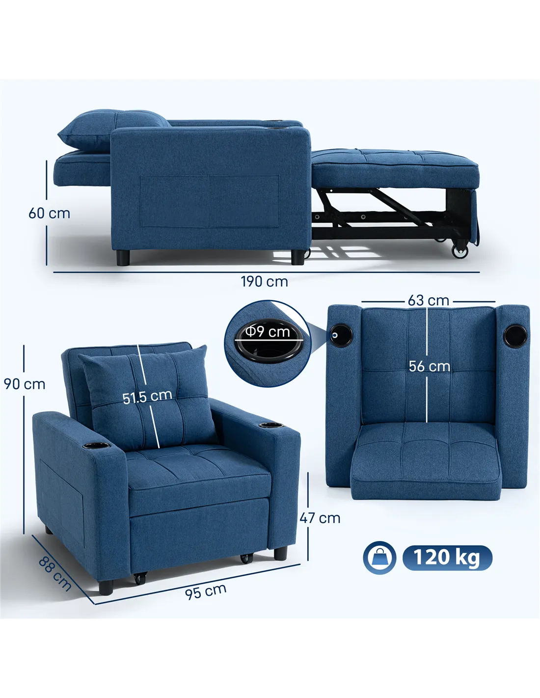 This HOMCOM 3-in-1 Single Sofa Bed in Dark Blue transforms your living space. Seamlessly switch between a comfortable armchair, a relaxing reclining lounger, and a full single bed. Ideal for UK homes requiring adaptable furniture, this convertible sleeper chair bed offers exceptional versatility. Its 95W x 190D cm bed size provides ample sleeping room, accommodating taller individuals with ease. The design incorporates high-density foam filling, ensuring lasting comfort and shape retention for daily use. Adjust the three-position backrest to your preferred angle for optimal relaxation. An included pillow offers additional comfort and support. Practical cup holders and side pockets keep your essentials within reach. Constructed with a robust wooden frame, this unit guarantees a strong and supportive core for years of reliable use.Features: