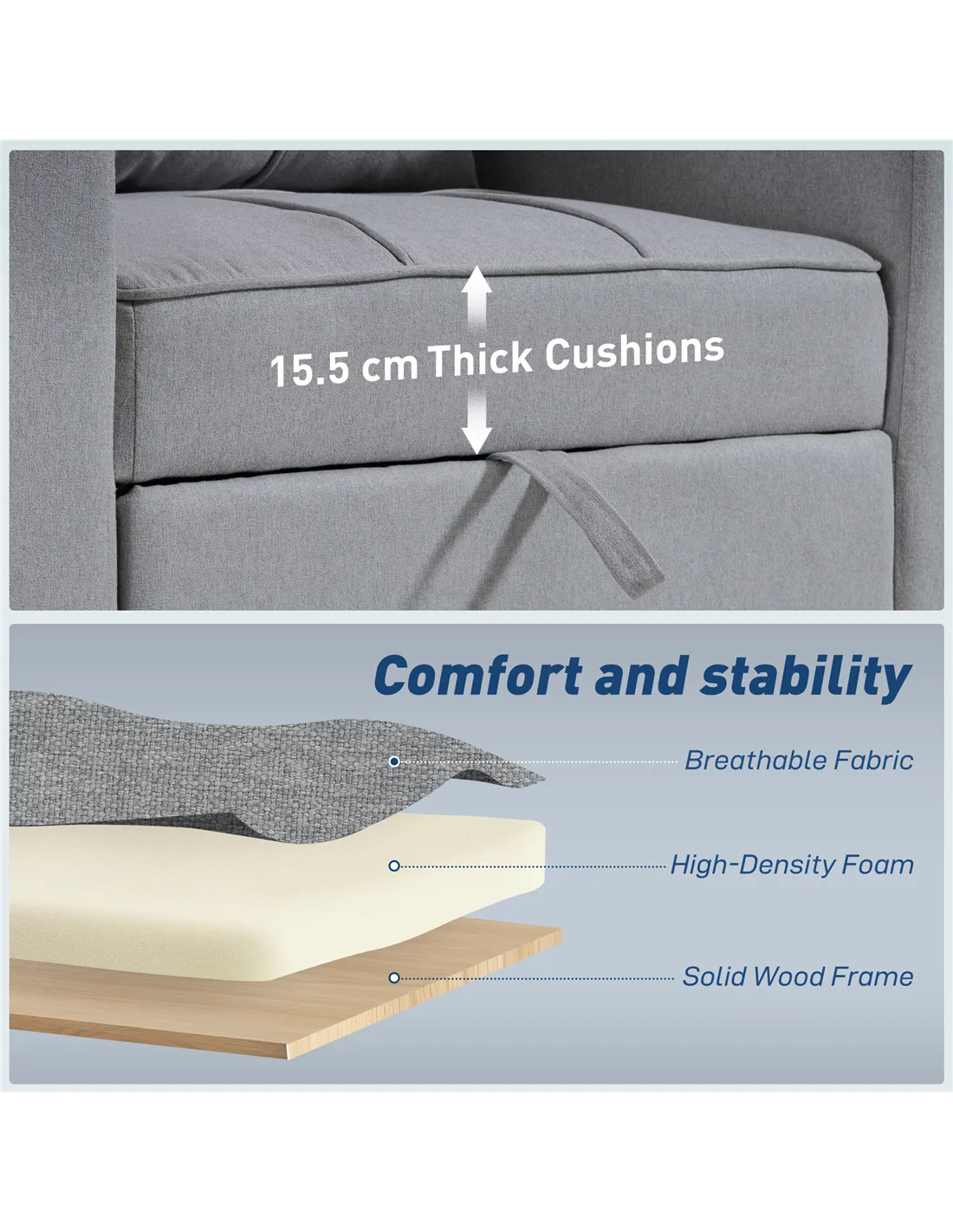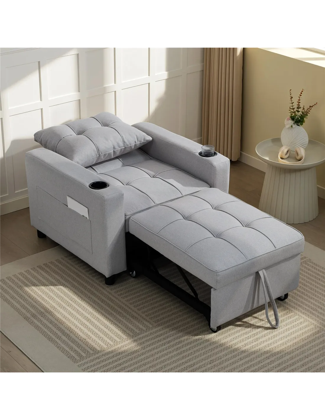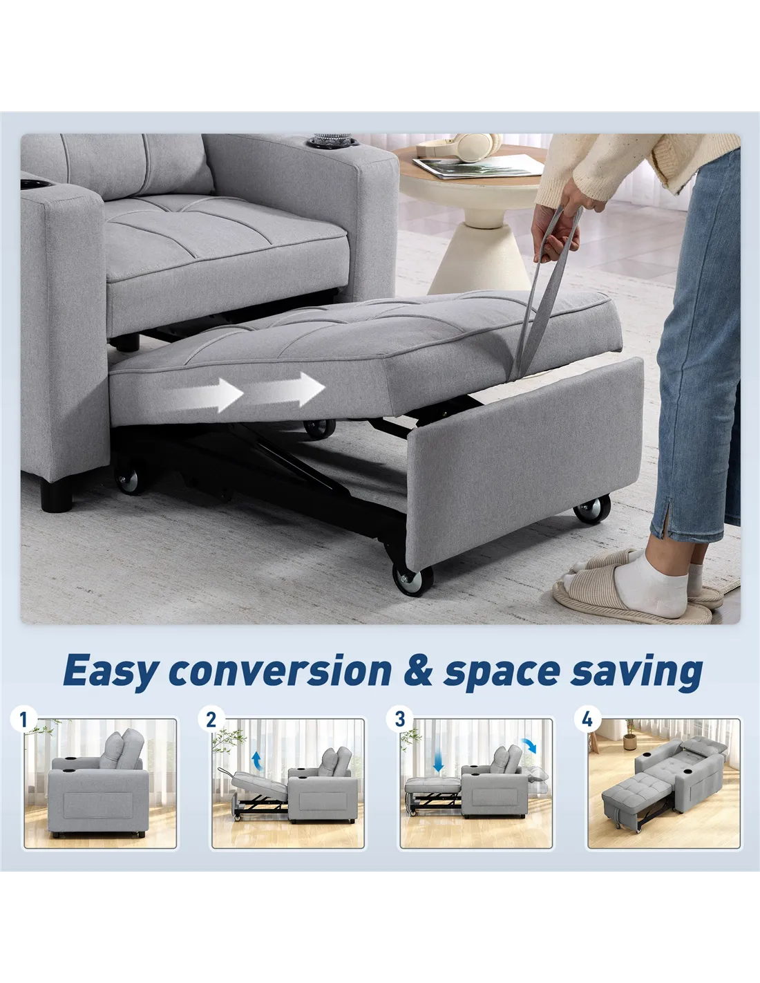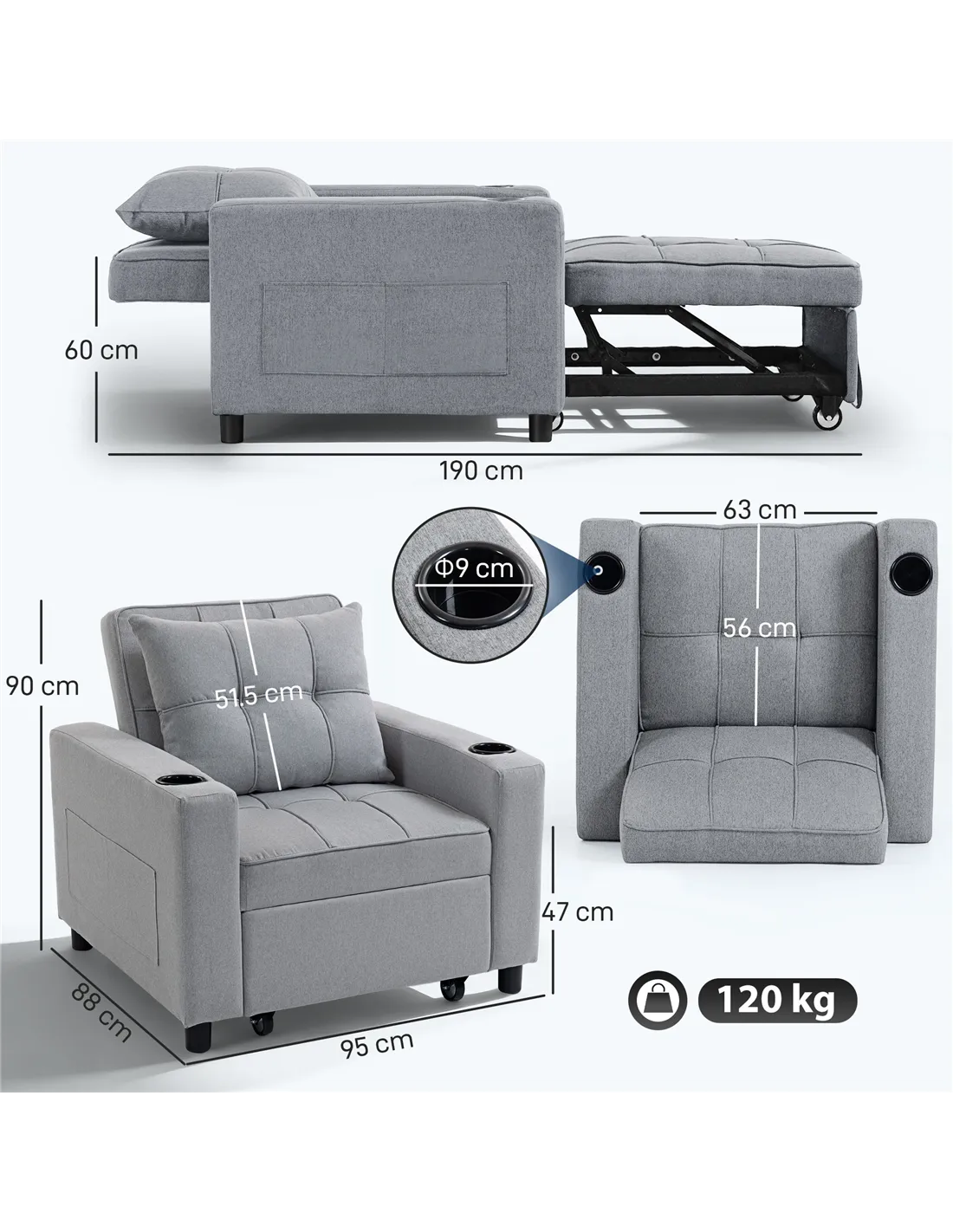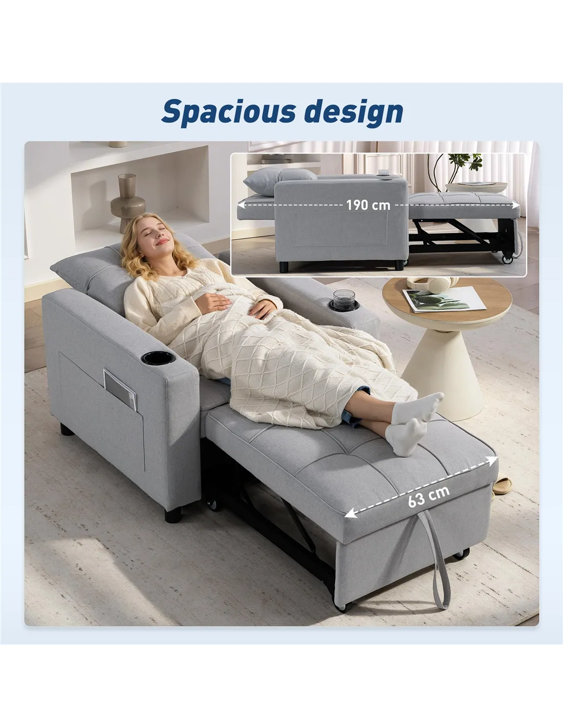 The HOMCOM 3-in-1 Single Sofa Bed in Light Grey offers outstanding adaptability for UK households. This convertible sleeper chair transitions effortlessly between a comfortable armchair, a relaxing reclining lounger, and a spacious single bed. It provides an ideal solution for optimising space in smaller living areas or accommodating overnight guests. The generous 95 x 190 cm bed size ensures ample room for a comfortable night's sleep, suiting even taller users. Constructed for daily utility, the sofa bed features high-density foam filling, maintaining shape and comfort. Adjust the backrest to one of three positions for your desired angle. Convenience features include integrated cup holders and side pockets, keeping essentials close. A sturdy wooden frame provides reliable support and long-term durability. An included pillow offers additional comfort.