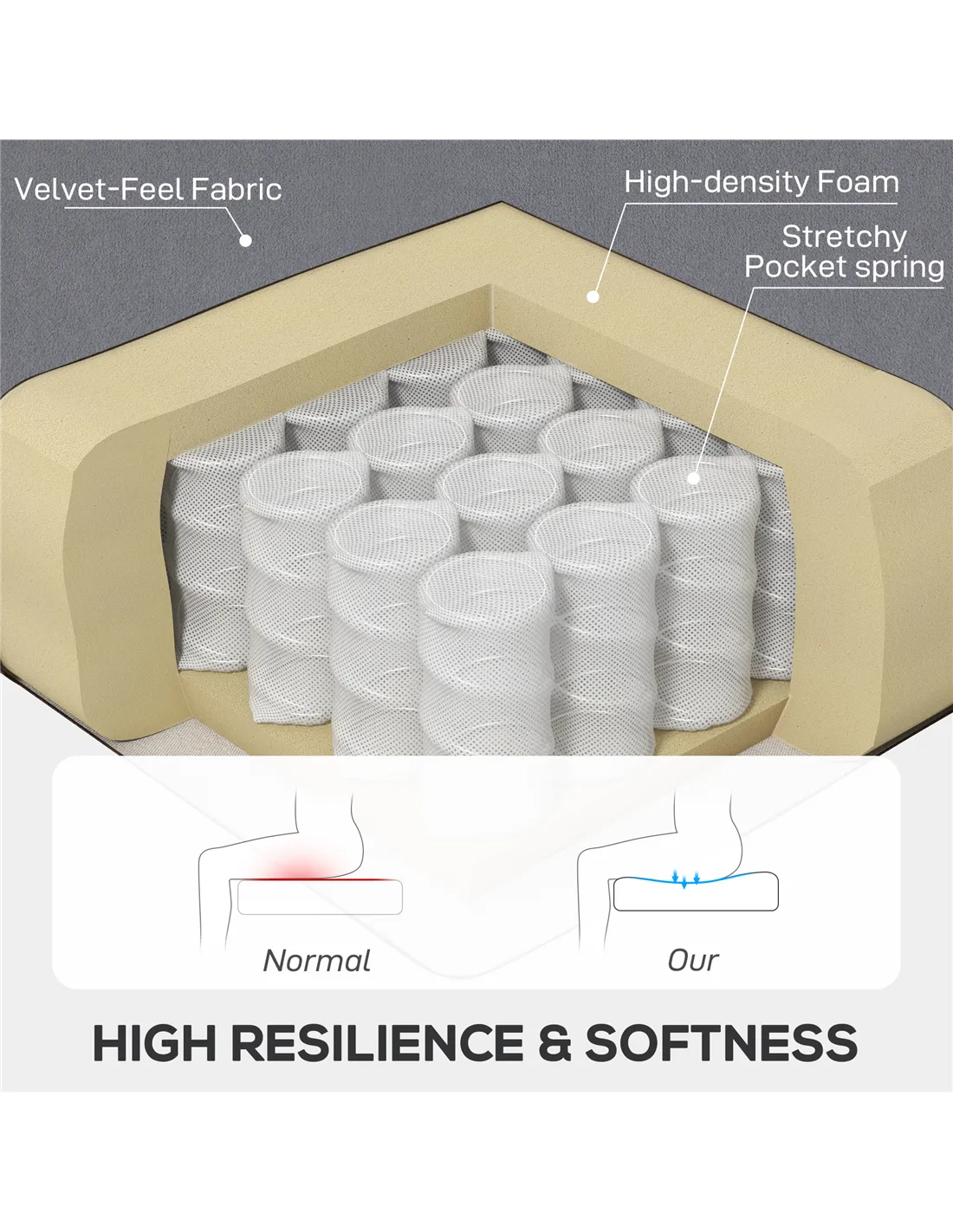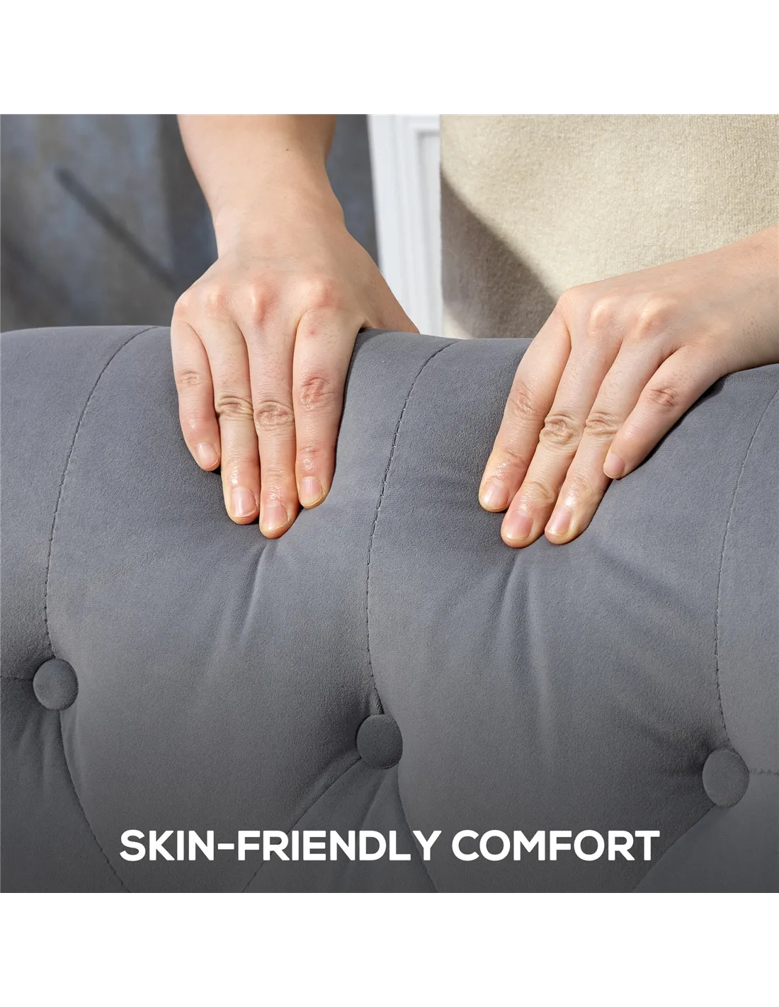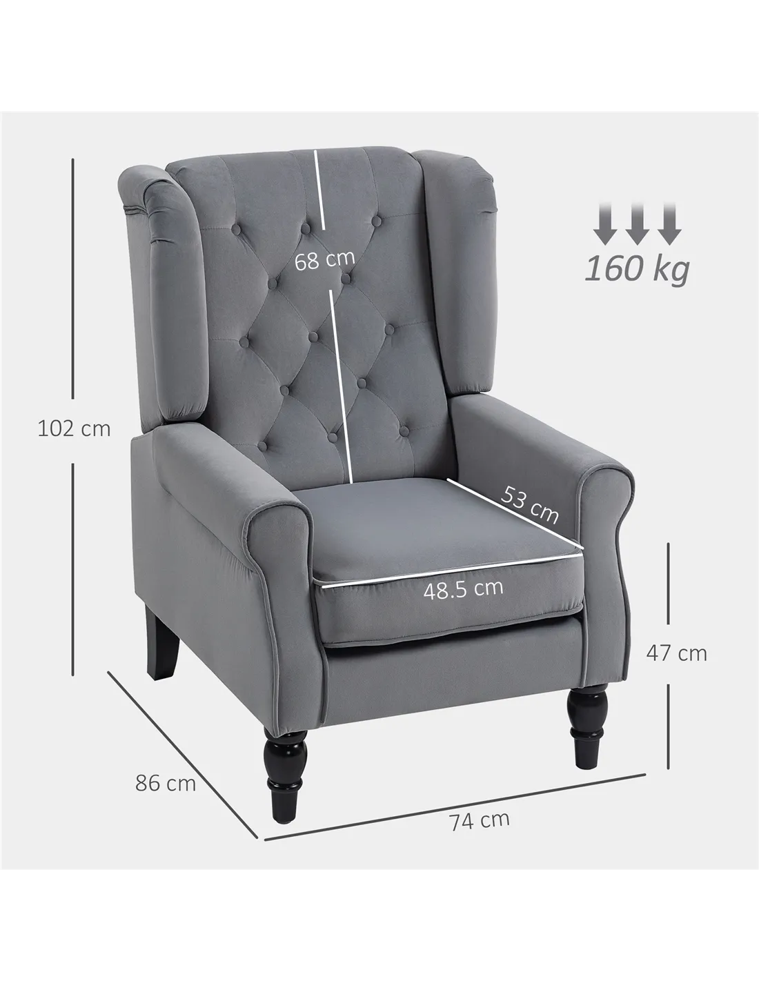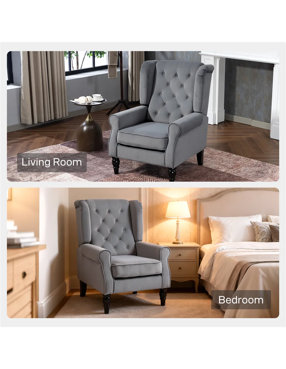 Bring a vintage touch to your home with the HOMCOM Wingback Accent Chair. This retro upholstered chair features a distinctive button-tufted design, an ideal addition for both living rooms and bedrooms. Its elegant light grey velvet-feel upholstery provides a soft, inviting surface. The chair rests upon a robust wooden frame and sturdy legs, ensuring a strong and solid foundation capable of supporting up to 160kg. Experience superior comfort through its thick foam padding, complemented by integrated pocket springs for reliable support. Deep tufting on the high-rise back and precise piping on the arms define a timeless aesthetic. This occasional chair offers a durable construction paired with a sophisticated design, delivering both comfort and style to your home. Assembly is required to complete this classic furniture piece.