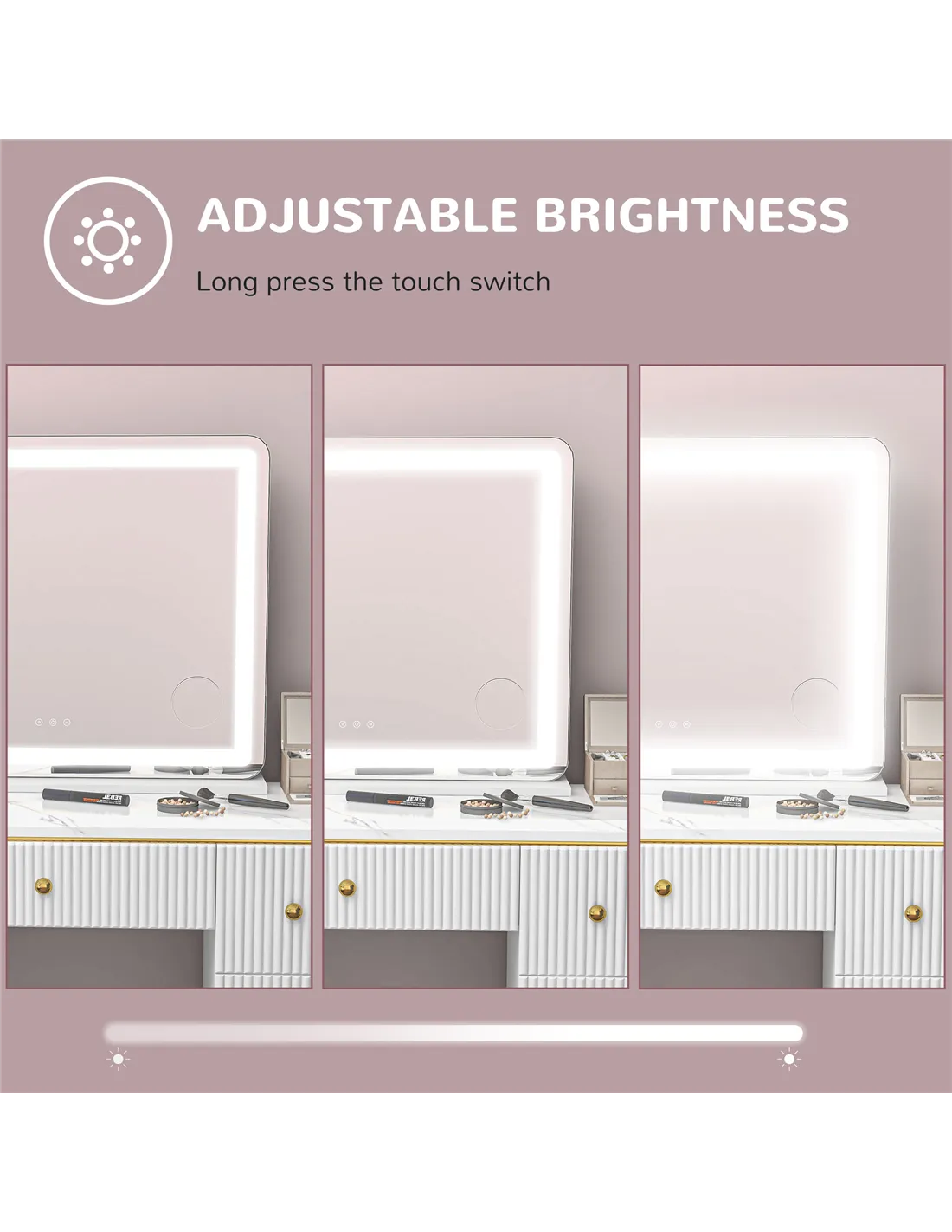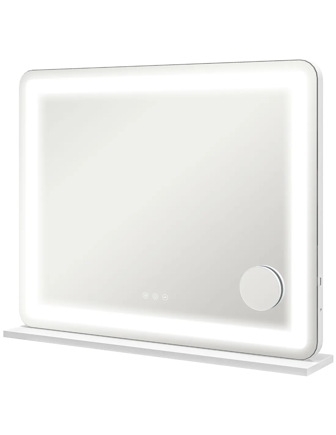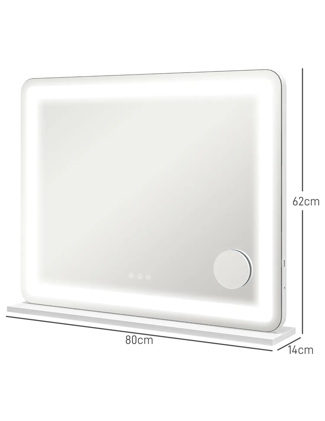 Enhance your daily beauty regimen with the HOMCOM Vanity Mirror with Lights, a generous 80x62 cm solution for comprehensive illumination. This white lighted makeup mirror offers three distinct colour temperatures: warm, cool, and natural, all controllable via its responsive touch screen. Adjust the brightness to your preference, ensuring perfect lighting for any application. A detachable 10x magnifying mirror provides exceptional detail for precise tasks. Power your essential devices using the convenient integrated USB charging port. Designed for ultimate flexibility, install this mirror as a tabletop unit or wall-mounted. Its robust 50,000-hour LED lifespan provides reliable, consistent lighting for years. Achieve a flawlessly illuminated reflection every time.