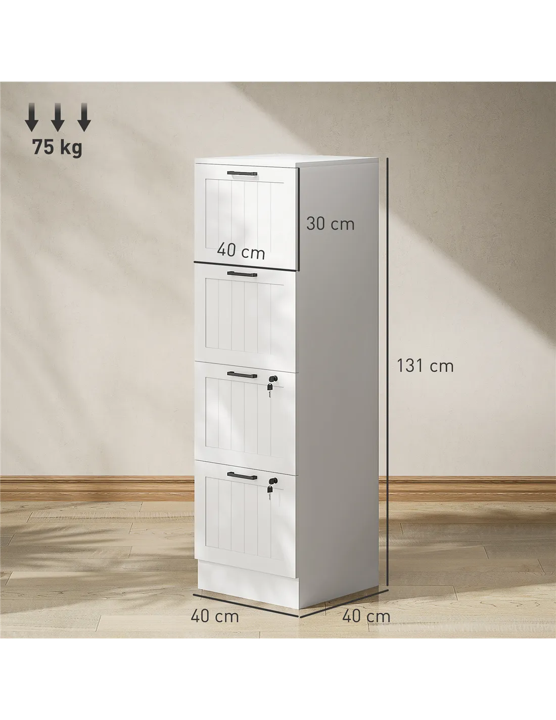 - A: The overall dimensions are 40W x 40D x 131H cm. Each drawer's inner size is 34W x 34D x 24H cm.