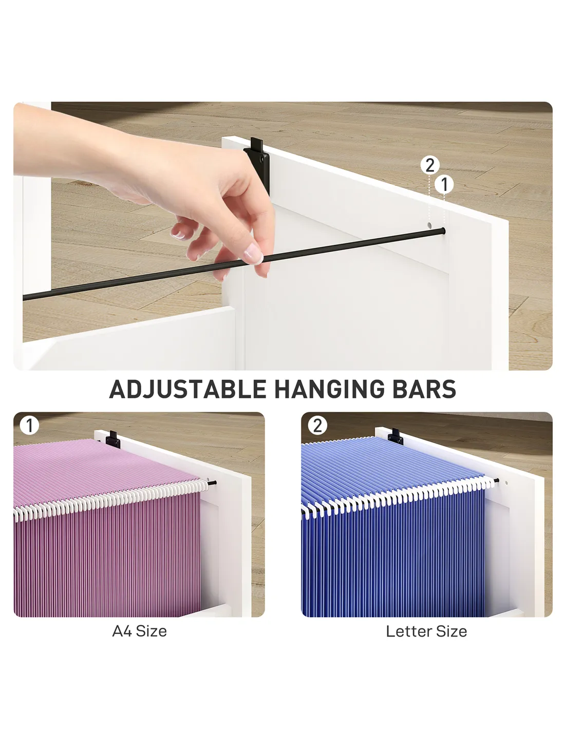 - A: Each drawer features adjustable rails, accommodating both A4 and letter-size folders.