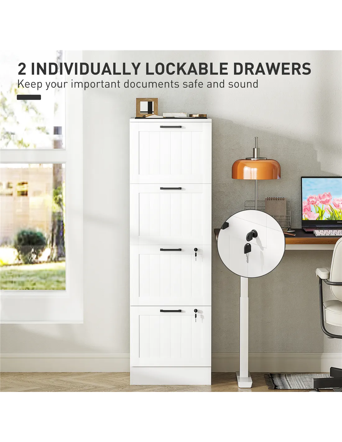 - Two drawers can be locked separately to secure important documents, including two keys per lock