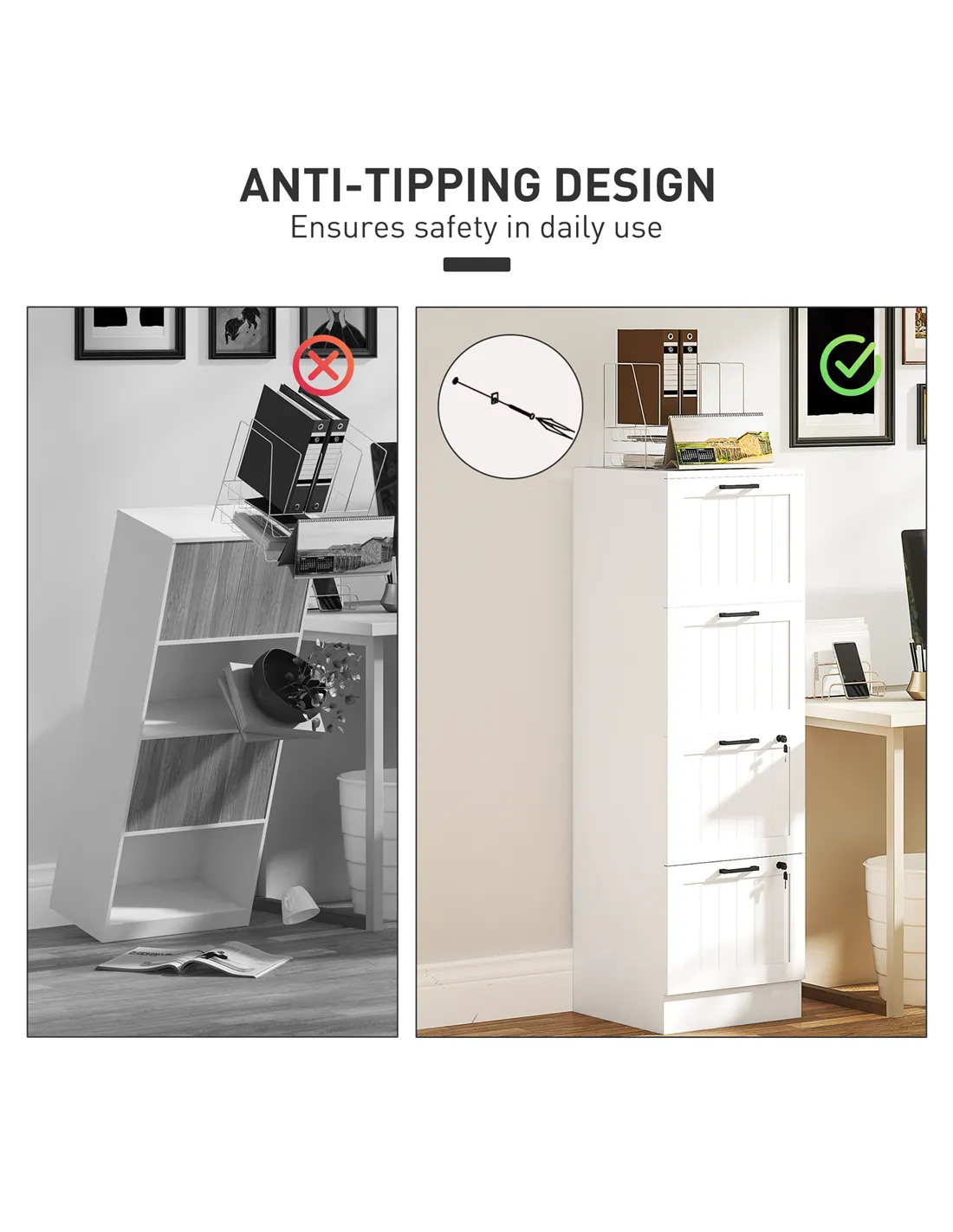 The HOMCOM 4 Drawer Filing Cabinet in white delivers a robust solution for your home office organisation needs. This office storage cabinet features four spacious drawers, designed to effectively minimise office clutter. Each drawer offers an adjustable rail, allowing you to store both A4 and letter-size documents with ease. Two drawers include a lock, complete with two keys per lock, securing your sensitive files and important paperwork. Its compact footprint conserves valuable floor space, fitting seamlessly into various room layouts. An anti-tip kit enhances stability and user safety. This versatile unit also functions as a practical printer stand, creating a comprehensive workspace. Maintain an organised and secure environment with this functional filing cabinet.