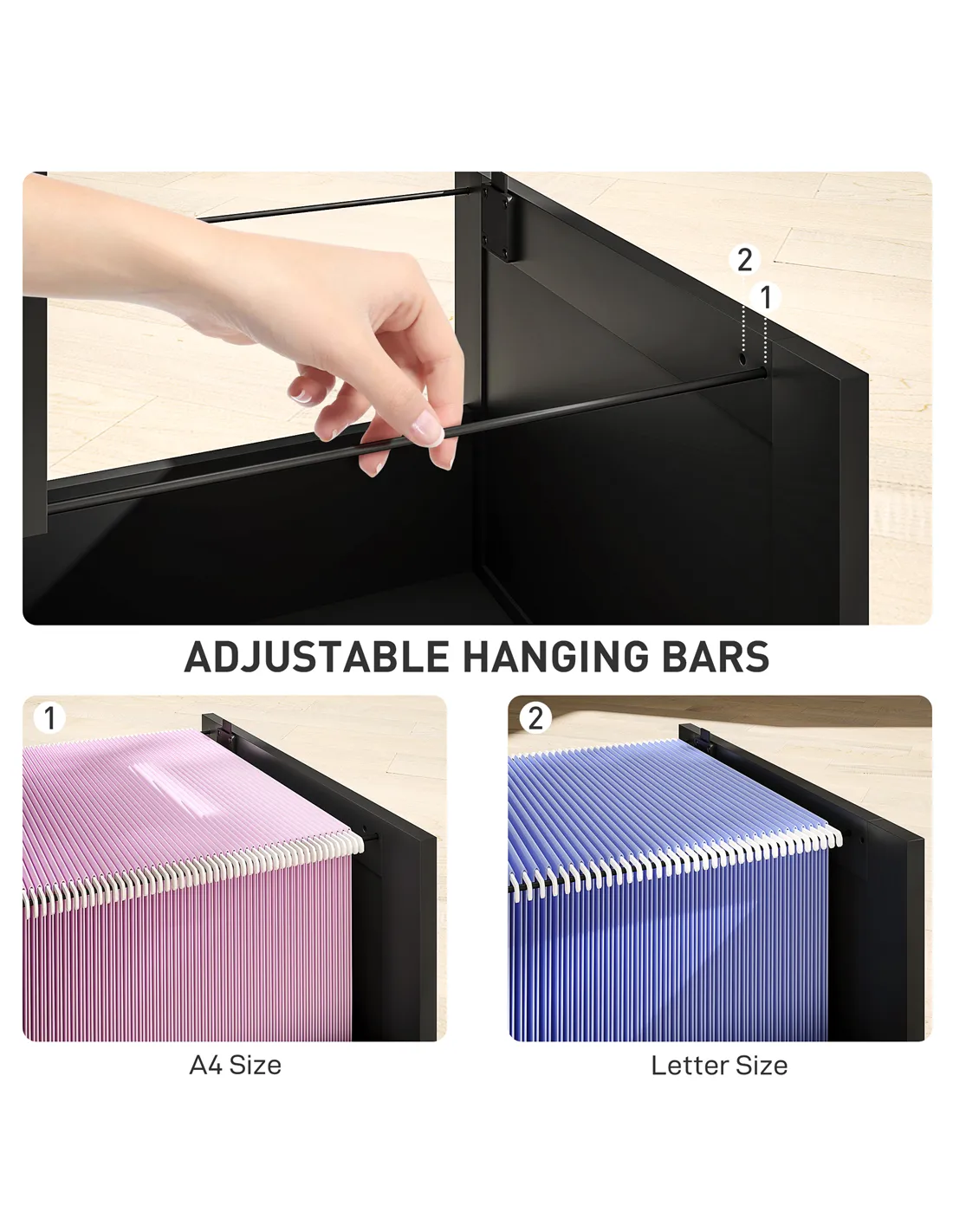 - Adjustable rail in each drawer to fit A4 and letter-size folders