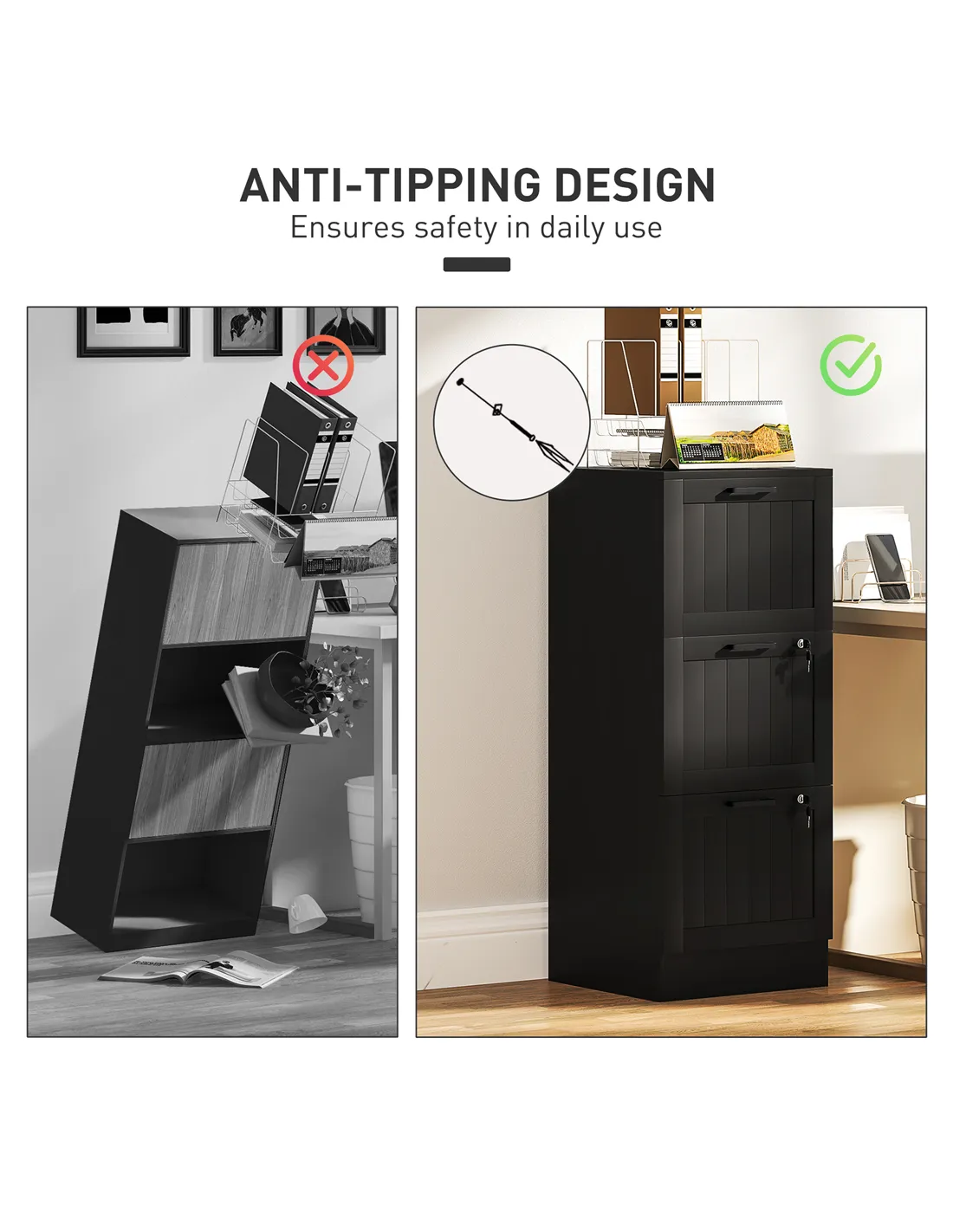 - Two drawers can be locked separately to secure important documents, including two keys per lock