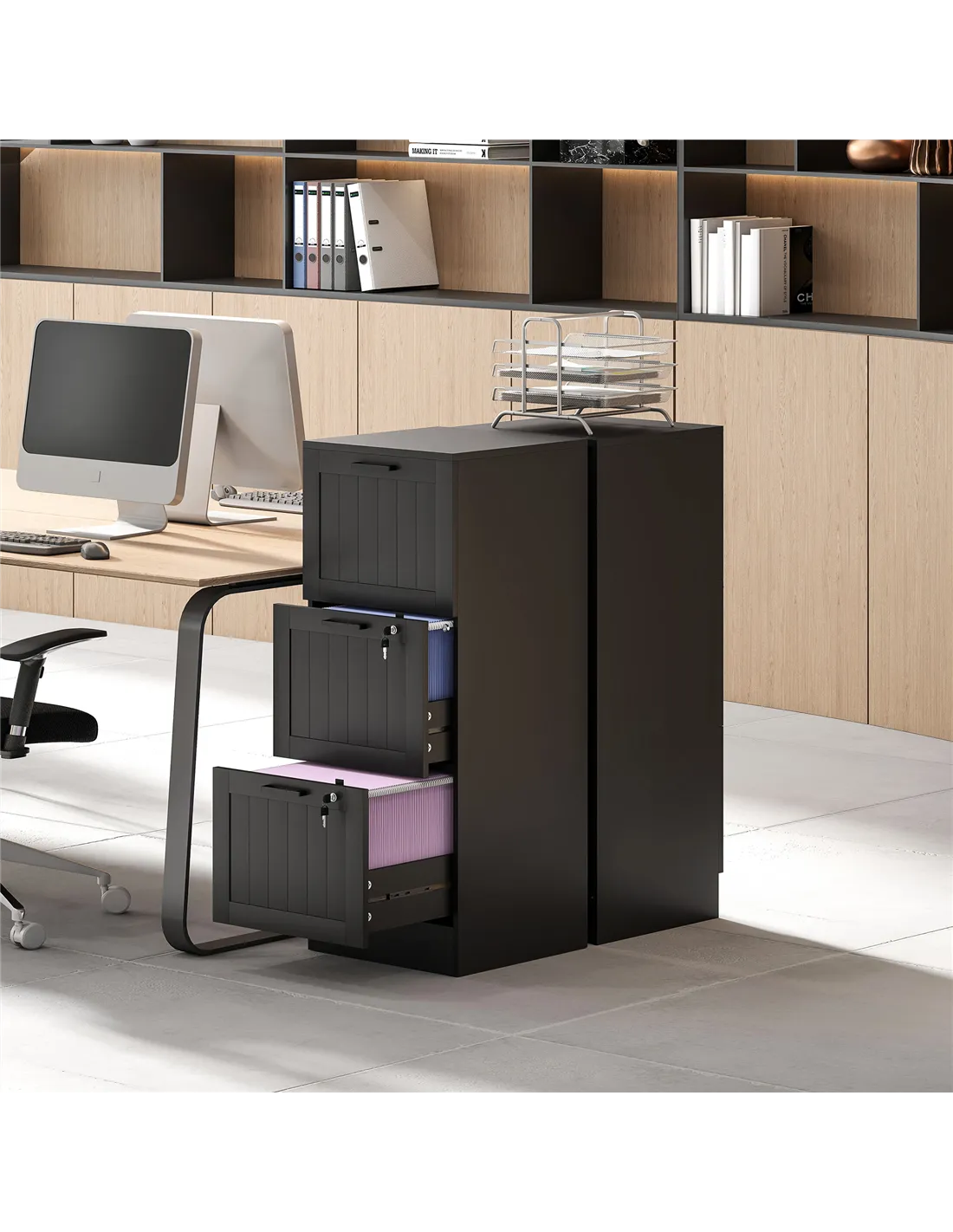 - Three file drawers minimizes office clutter