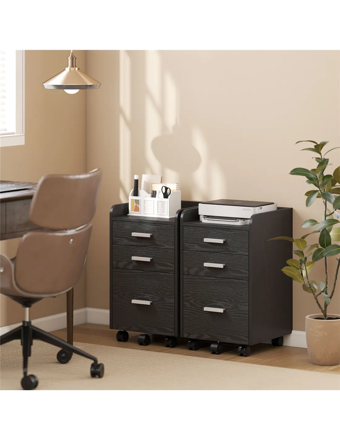 Organise your workspace efficiently with the HOMCOM 3 Drawer Filing Cabinet. This black, rolling cabinet offers practical storage for your home or office. It features three spacious drawers, including a large bottom drawer with hanging bars for Letter and A4 size files. The top two drawers store papers and stationery. Crafted from robust MDF and particle board, this cabinet ensures lasting durability. Its compact dimensions allow it to slot neatly under most desks, maximising floor space. Five smooth-rolling wheels provide easy movement, with two brakes for secure positioning. A central caster adds stability. The edged top surface offers a convenient, stable platform for a small printer or other devices. This cabinet helps maintain a tidy, functional work environment.Features: