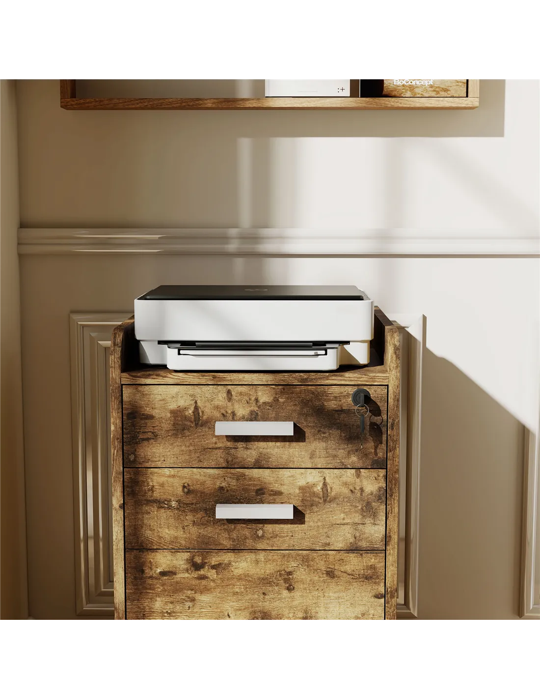Organise your workspace efficiently with the HOMCOM 3 Drawer Filing Cabinet. This versatile under-desk unit, finished in a rustic brown wood effect, provides secure and accessible storage for your office essentials. Its design accommodates letter and A4 size documents, including hanging file folders in the larger bottom drawer. The cabinet features three spacious drawers, with the top drawer offering security via an integrated lock and two keys.