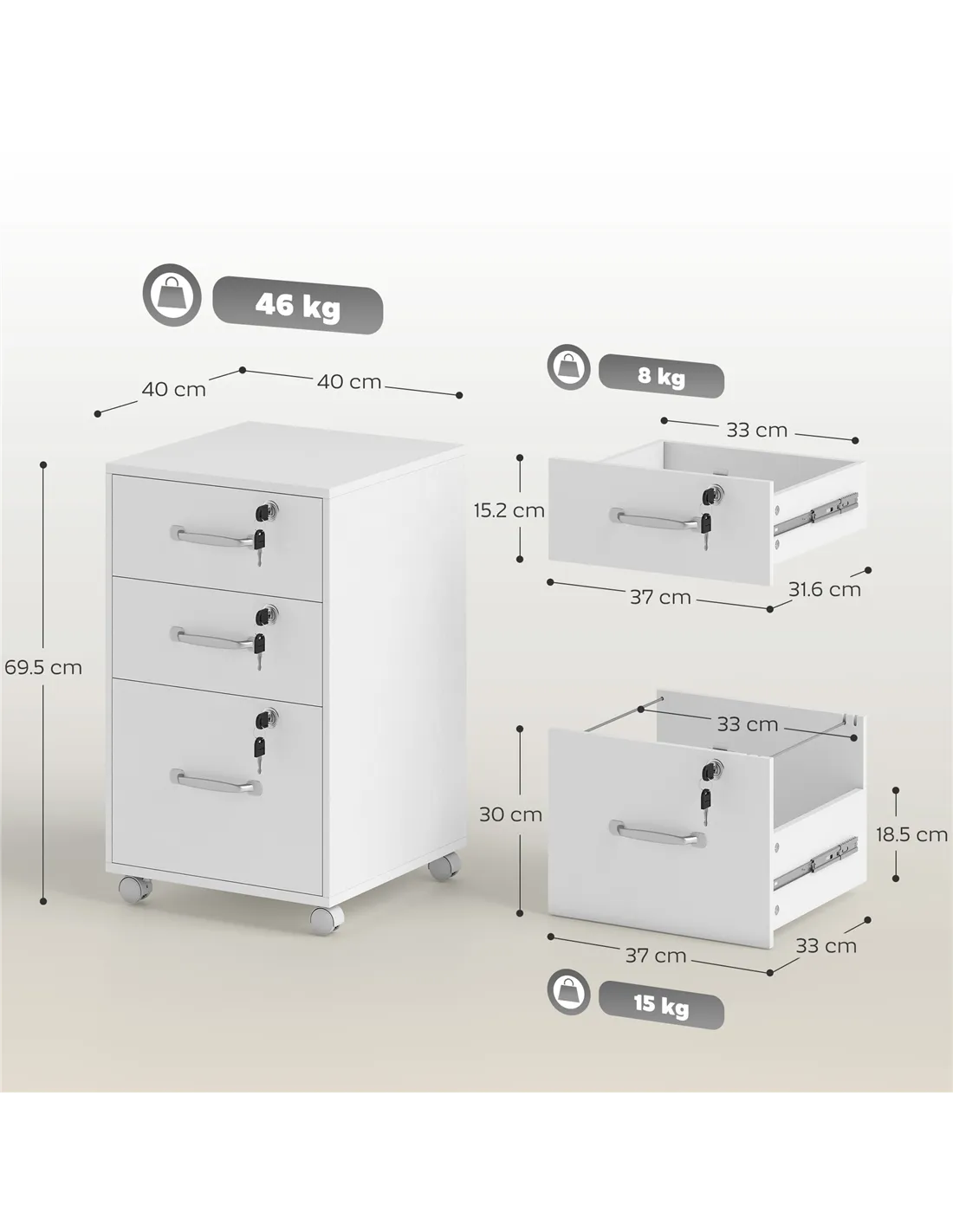 - Maximum Load: 46 kg (Total), 15 kg (File Drawer/Top), 8 kg (Small Drawer)