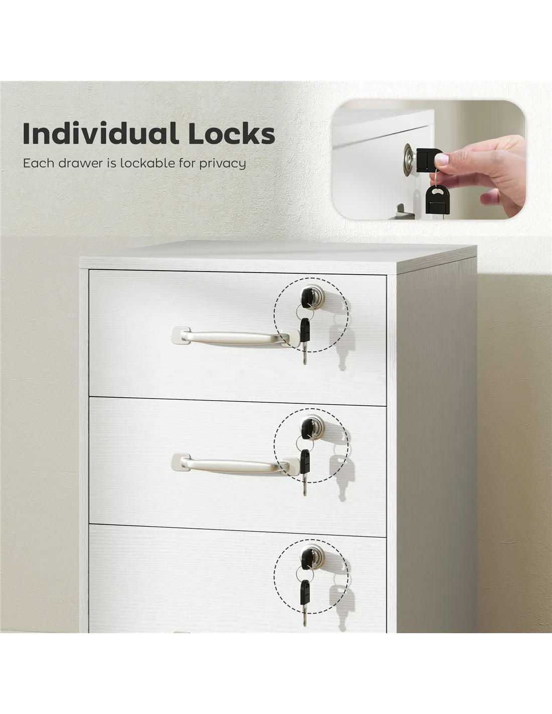 - Individual lock on each drawer for security. Two keys per each lock