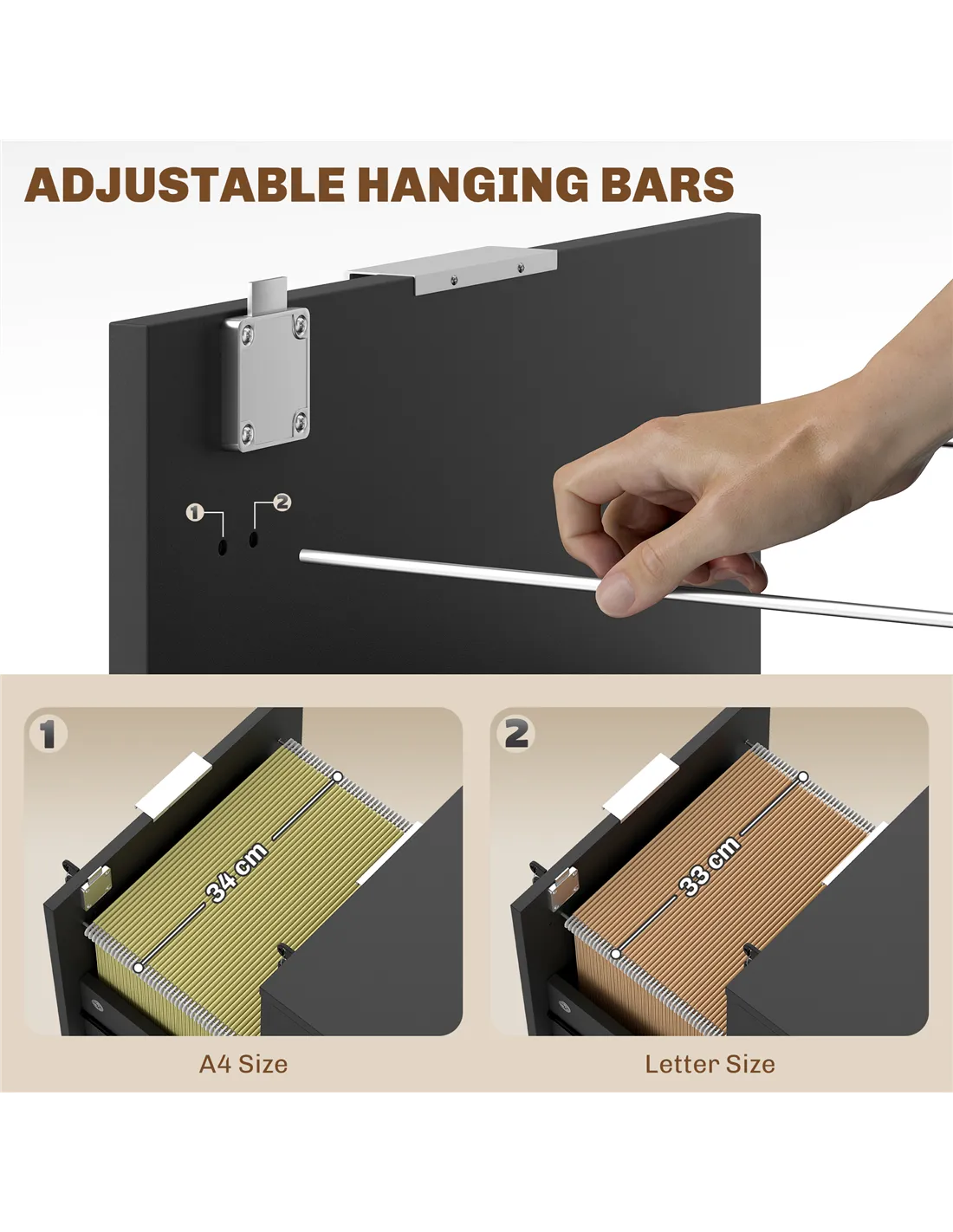 - Lockable filing cabinet comes with a small and large drawer. Adjustable bar in big drawer for holding A4/letter files