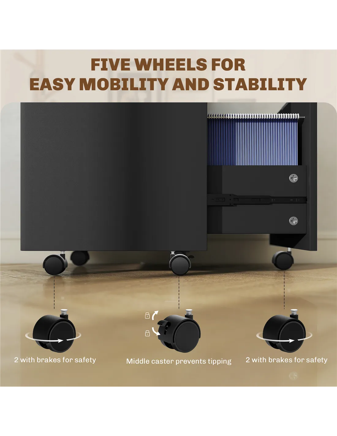 - A: The cabinet features five wheels for easy mobility, including two with brakes and a middle anti-tip wheel for stability. Its overall dimensions are 42W x 40D x 60Hcm.