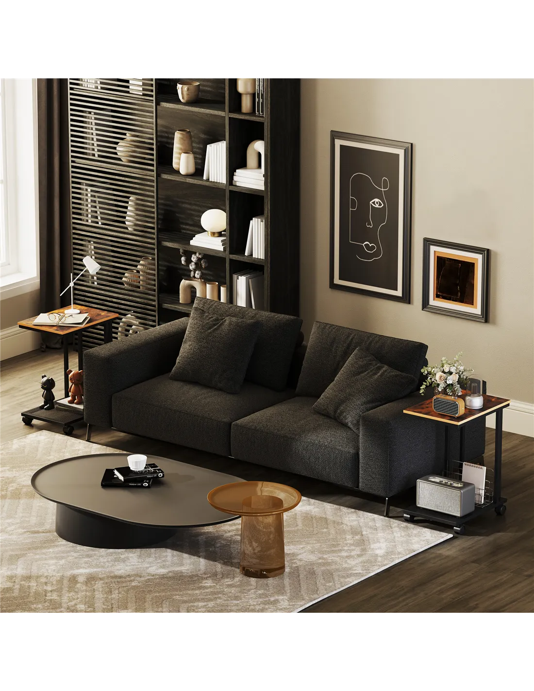 HOMCOM C Shaped Side Table Set of 2 with Wheels, Mobile End Table, Laptop Stand with Metal Frame and Storage Shelf, Rustic Brown