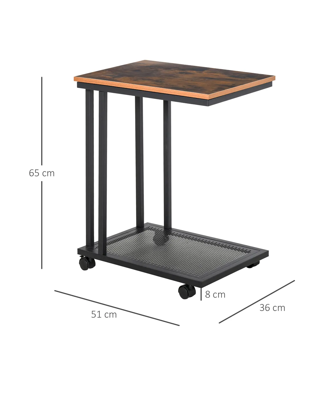 Enhance your living space with the HOMCOM C Shaped Side Table Set of 2. These mobile end tables offer versatile functionality for UK households. Each table features a practical C-shaped design, allowing it to slide conveniently alongside your sofa, armchair, or bed. Use them as an ergonomic laptop stand, a stable surface for drinks and snacks, or a handy platform for books and remotes. The robust metal frame ensures durability, complemented by a stylish rustic brown MDF worktop. Four smooth-rolling castors enable effortless repositioning, preventing floor damage. A spacious bottom mesh tray provides valuable extra storage. This set seamlessly integrates style and utility, enhancing any room, from your living room to a conservatory. Each table measures 51L x 36W x 65H cm and supports a weight of 10 kg. Experience dual convenience and adaptable design for modern living.
