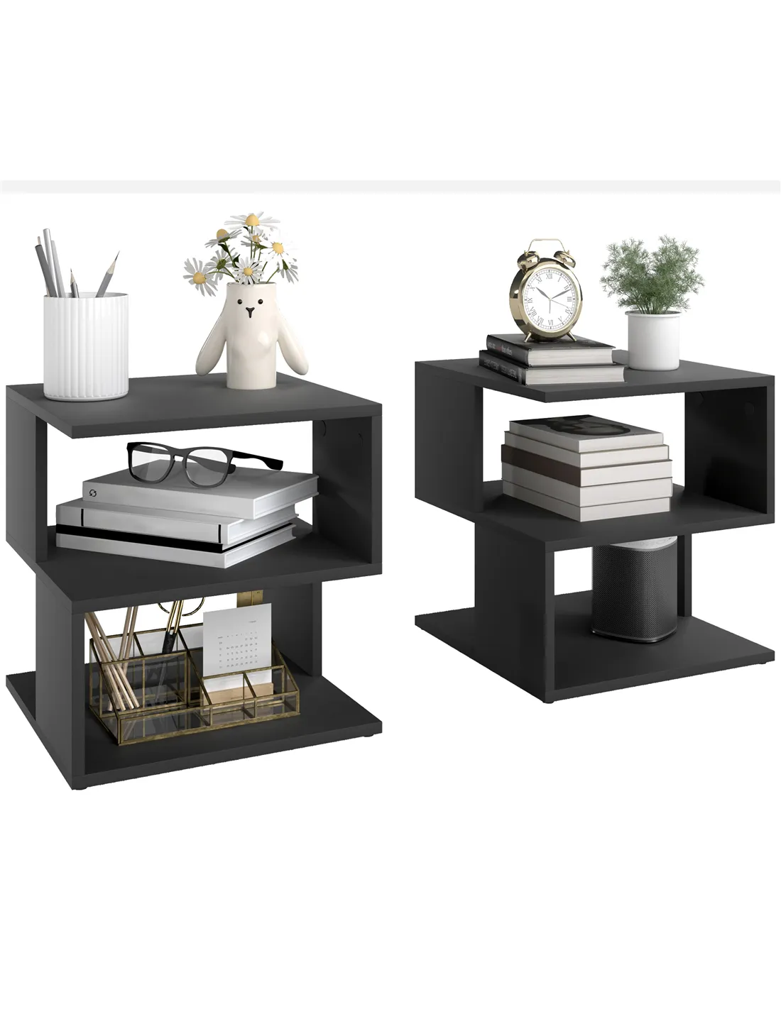 HOMCOM Set of 2 Side Table Square Coffee Table, Modern End Table with 2 Tier Storage Shelves for Living Room, Bedroom, Black