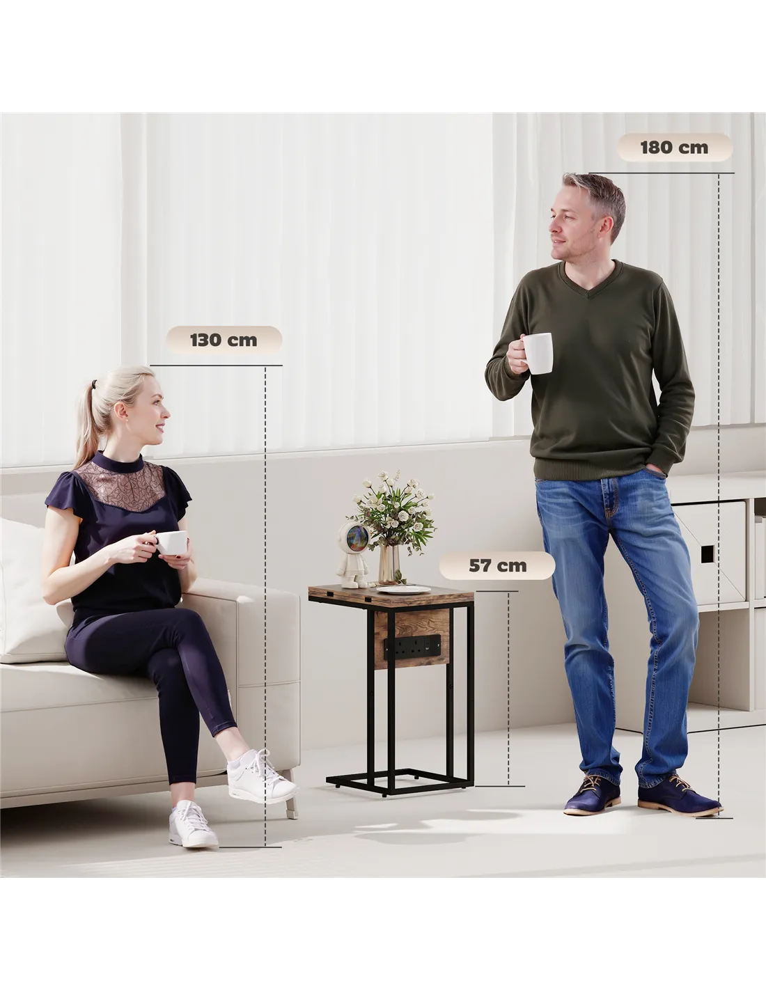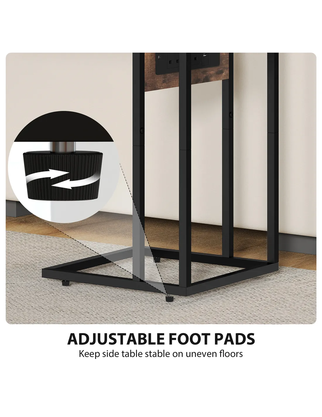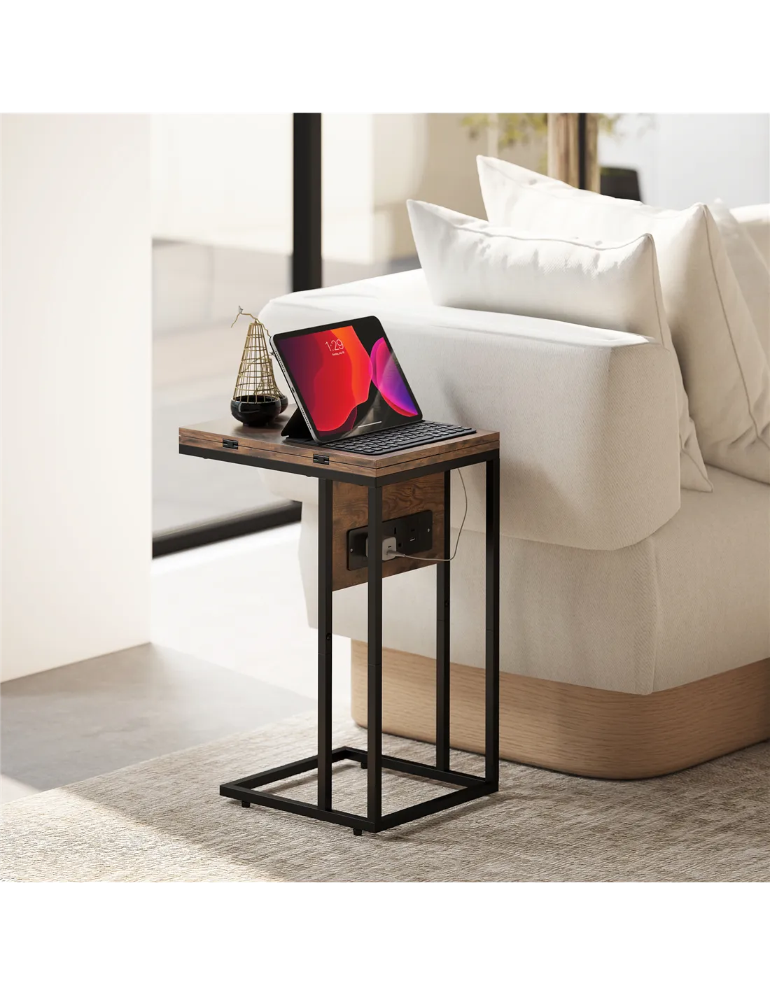 Optimise your living space with the HOMCOM C Shaped Side Table, featuring a built-in charging station and a versatile foldable top. This rustic brown industrial-style table is designed for UK homes, offering essential functionality and modern aesthetics. Its clever C-shaped frame effortlessly slides under your sofa or bed, saving valuable floor space. The integrated charging station provides two power outlets, a USB port, and a USB-C port, ensuring all your devices remain charged and accessible. Expand the tabletop for extra surface area when needed, or fold it down for compact storage. This adaptable table serves effectively as a bedside companion, a convenient sofa side table, or a small, efficient workspace. Crafted from robust metal and MDF, it offers lasting durability. The sleek black frame complements the rustic brown top, creating a distinct industrial look. Adjustable feet stabilise the table on various surfaces, completing its practical design.