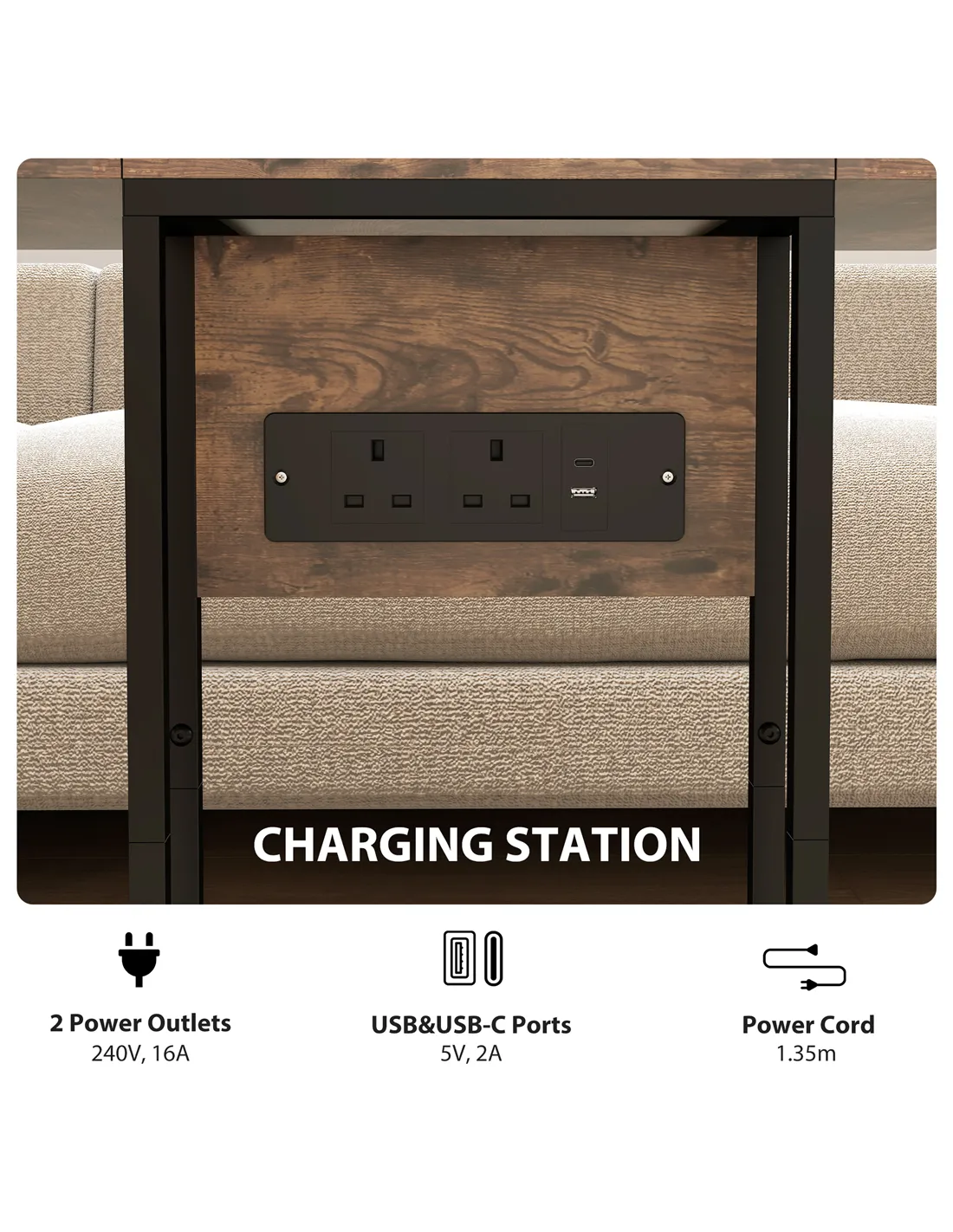 - A: The integrated charging station features two standard power outlets, one USB port, and one USB-C port, providing convenient power for your devices.
