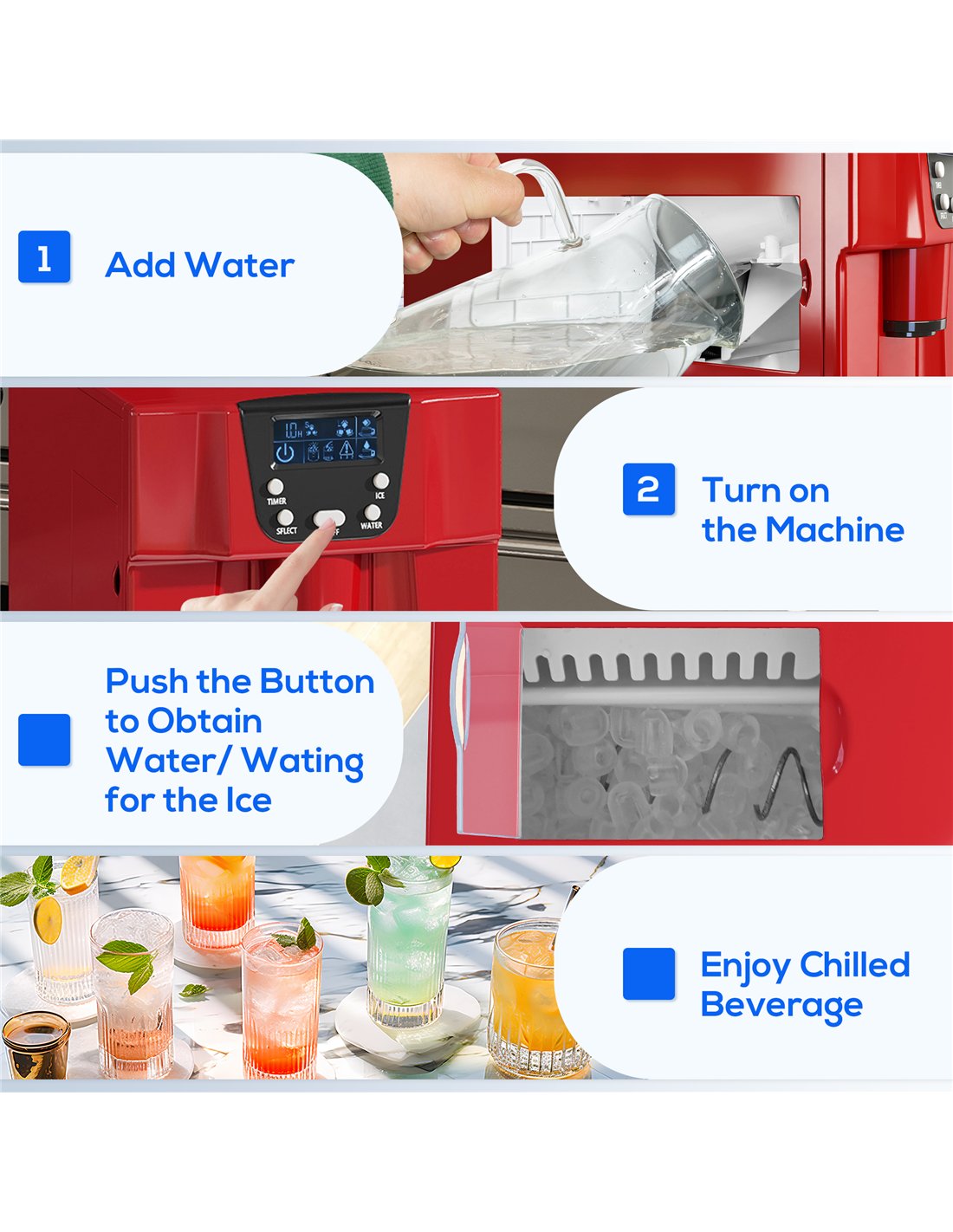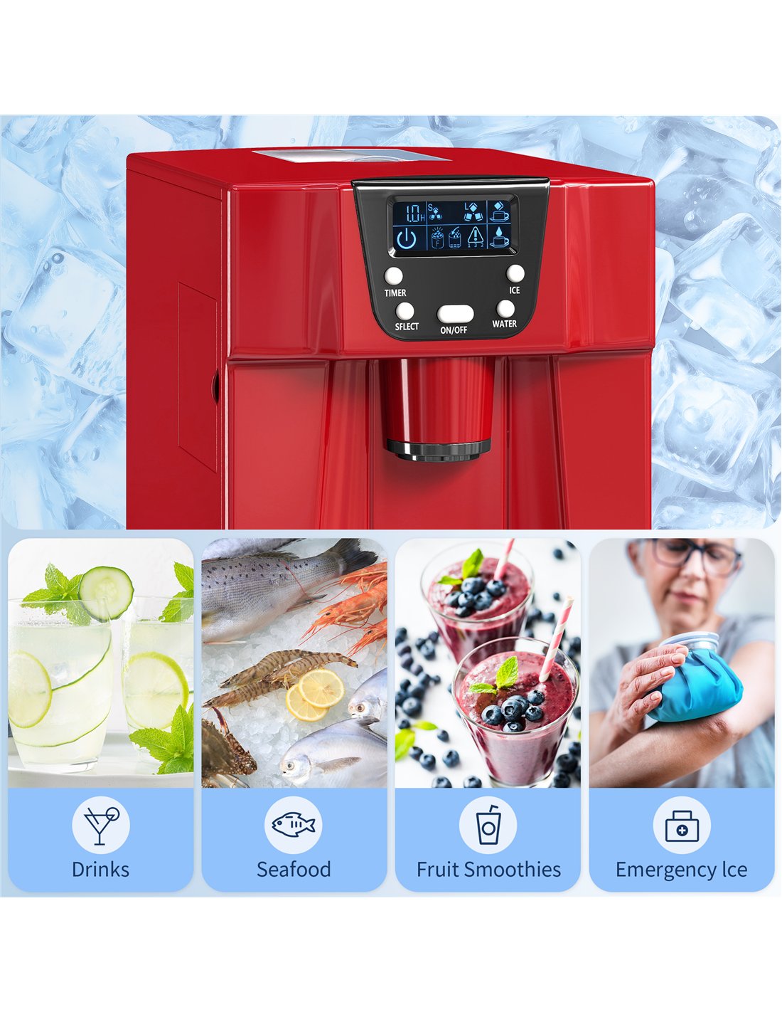 The HOMCOM 3L Ice Maker Machine and Water Dispenser provides rapid, refreshing ice and chilled water for your home. This compact red unit produces 9 ice cubes in just 6-10 minutes, generating up to 12kg of ice daily. Choose between two ice cube sizes, small or large, to meet your specific cooling requirements. Beyond ice production, this appliance functions as a convenient water dispenser. Its generous 3-litre water tank ensures a constant supply. An integrated LCD display shows ice and water status, alongside a timer for automated ice making. Operating quietly at a maximum of 43 dB(A), it integrates discreetly into any kitchen. A drip tray simplifies cleaning. This unit arrives ready for use; no assembly is required.