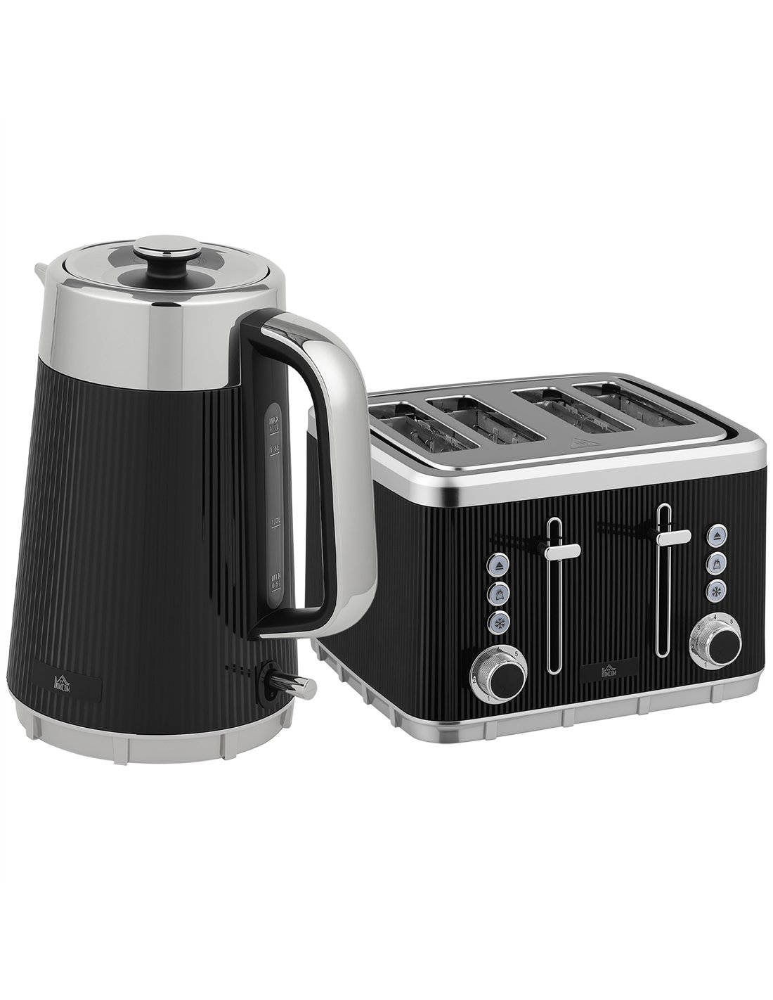 Optimise your kitchen with the HOMCOM Electric Stainless Steel Kettle and Toaster Set from FastDaddy. This black 3000W 1.7L fast boil kettle features a UK Strix thermostat for precise temperature control. It includes auto shut-off, boil-dry, and overheat protection. A limescale filter maintains performance, while the cool touch lower body enhances safety. The accompanying 4 slice toaster provides independent dual controls, offering 7 browning levels. Enjoy defrost, reheat, and cancel functions. Prepare toast consistently with automatic bread centering. Both appliances boast a unified black finish with vertical ridges and polished silver accents, enhancing modern kitchen aesthetics. Experience efficient, safe breakfast preparation with this essential set. Its user-friendly design includes a 360° kettle base with cord storage and a removable crumb tray for easy cleaning.
