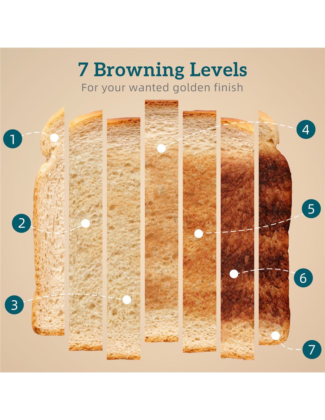 - A: The 4-slice toaster offers 7 browning levels on each of its dual-controlled pairs of slots. It also provides defrost, reheat, and cancel functions for versatile toasting.