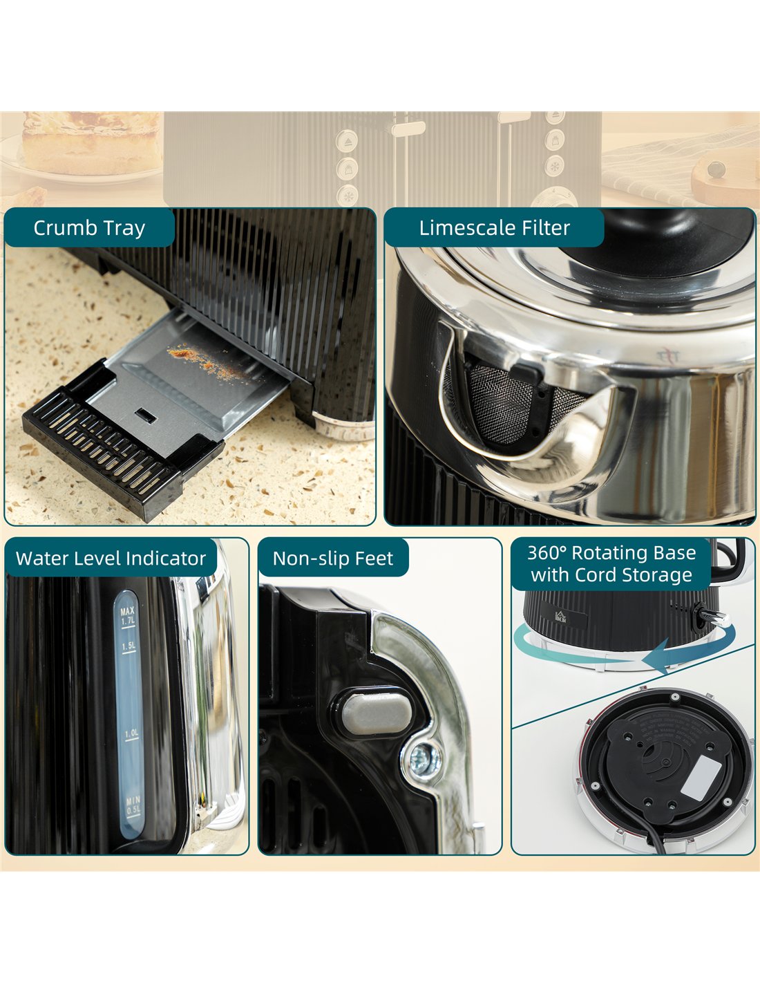 - A: Yes, the kettle includes a limescale filter for easy maintenance. The toaster has a removable crumb tray, simplifying cleanup after use. Both features promote hygiene and prolong the product's lifespan.
