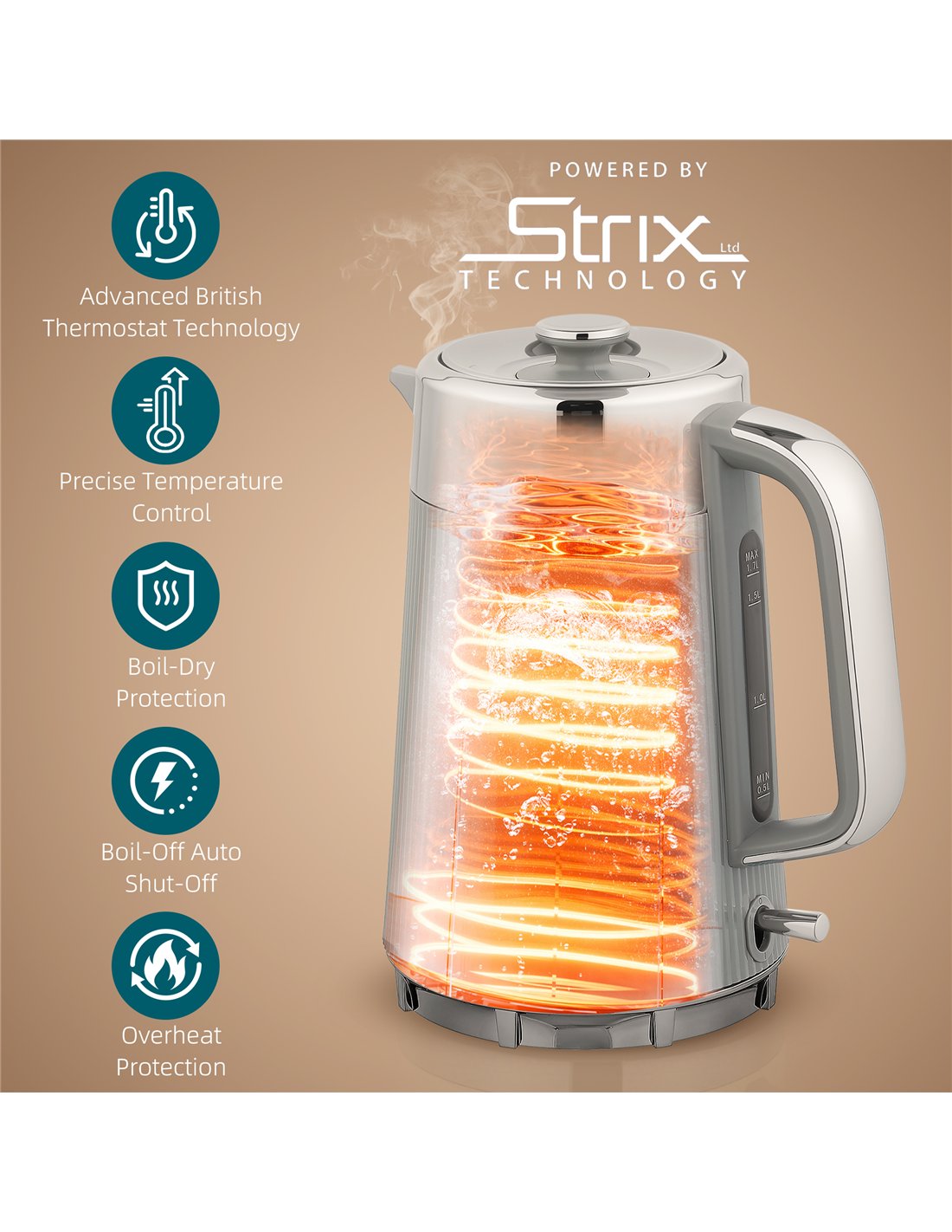 - Kettle with UK Strix thermostat for precise temp control and safety, meanwhile, a cool-touch lower body for safety