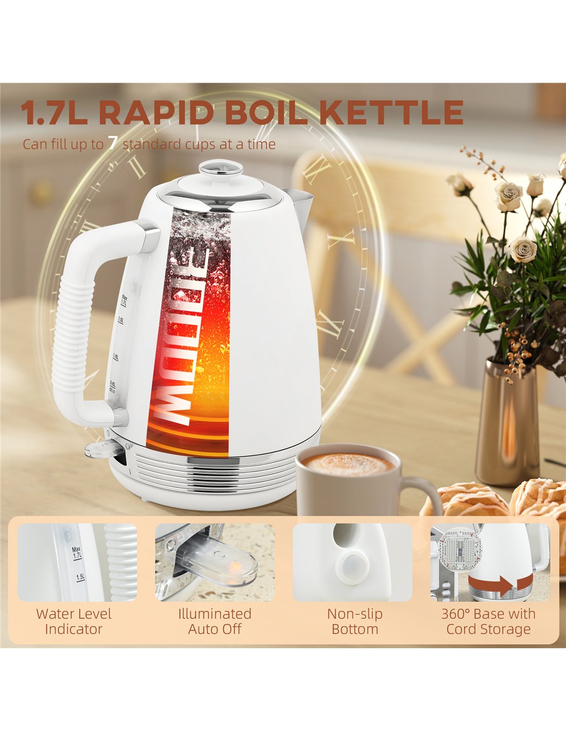 - Boils up to 1.7L in minutes with powerful 3000W - suit for 7 cups