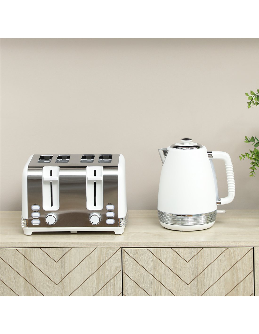 - Set includes a kettle and 4-slice toaster, unified style