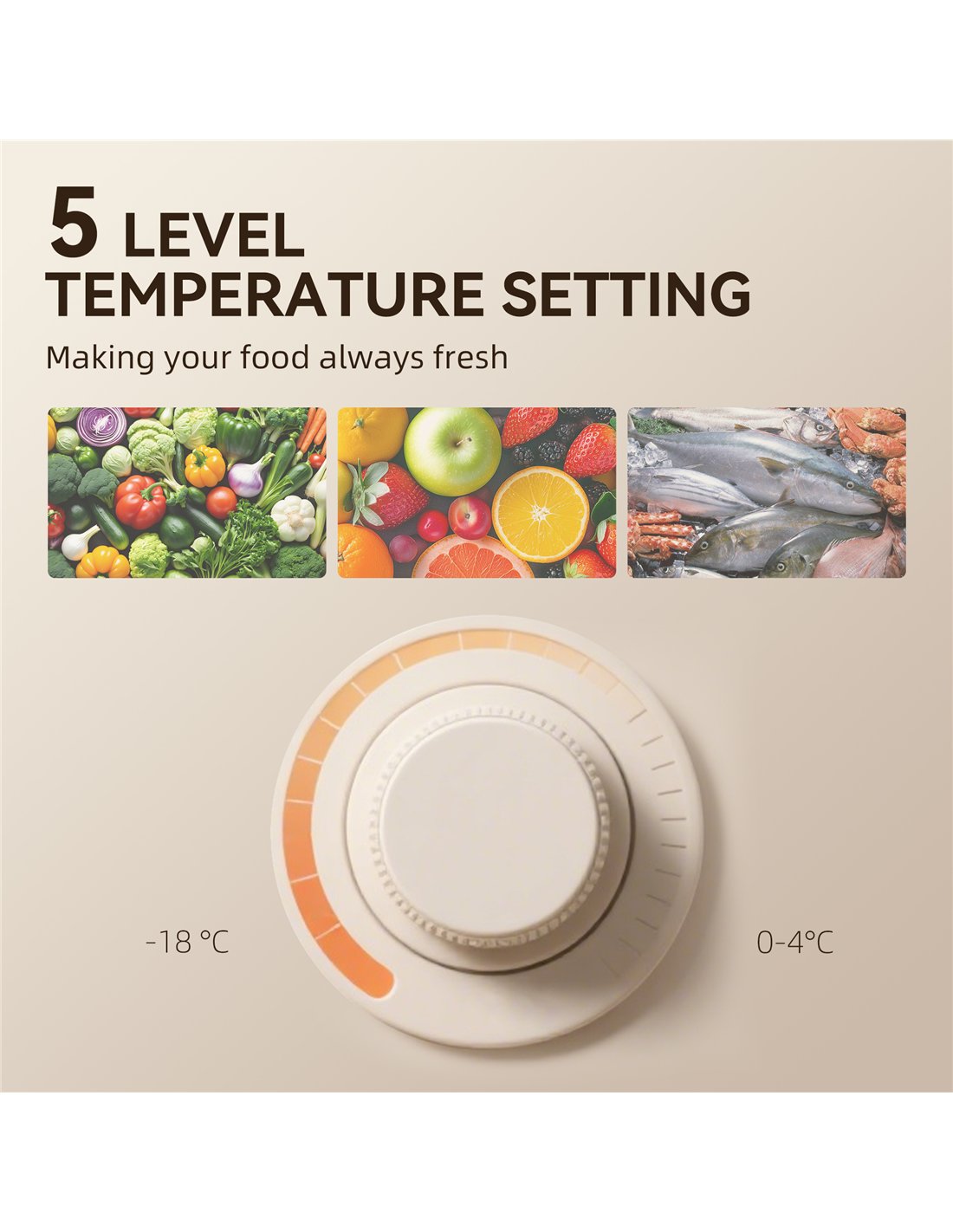 - Five temperature dial for control: fridge 0°C-4°C, freezer ≤-18°C