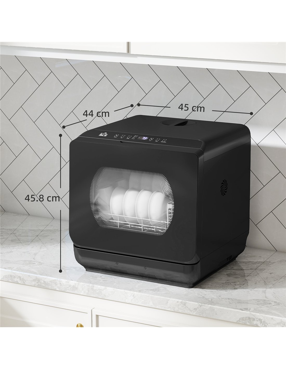 End manual dishwashing with the HOMCOM Table Top Dishwasher, a compact solution for your UK home. This mini countertop unit offers powerful cleaning for four place settings, fitting seamlessly into smaller kitchens or apartments. Its 6L built-in water tank provides freedom; operate it without a direct tap connection, ideal for various locations. Connect it directly to your water supply when preferred. Six distinct wash programmes cater to your needs: Intensive, Efficient, Normal, Rapid, Fruit wash, and an automatic Drying cycle. The efficient spray arm delivers sparkling results for your tableware. Manage your schedule with the 1-12 hour delay start function. An intuitive LED panel makes program selection straightforward. This black dishwasher simplifies your daily routine, providing convenience and cleanliness.