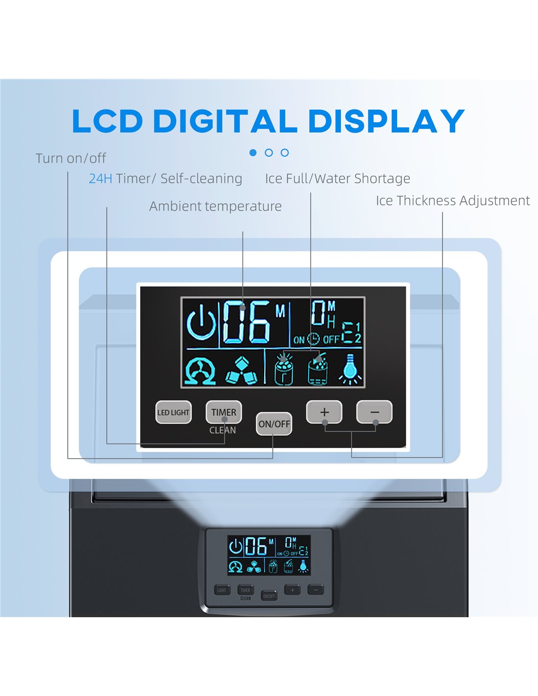 - Easy-to-read indicators show water shortage, water intake, ice making, ice full and ambient temperature
