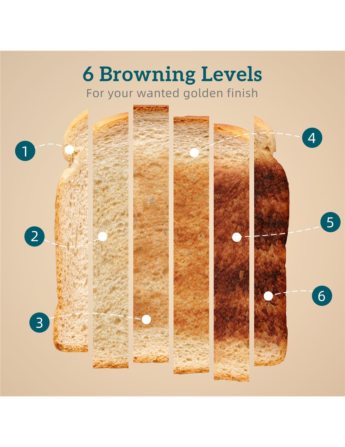 - Two-slice toaster has six browning levels. Defrost, reheat and cancel function