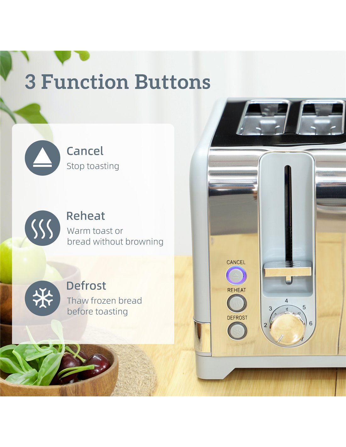 - A: Yes, the four-slice toaster features seven browning levels, along with defrost, reheat, and cancel functions.