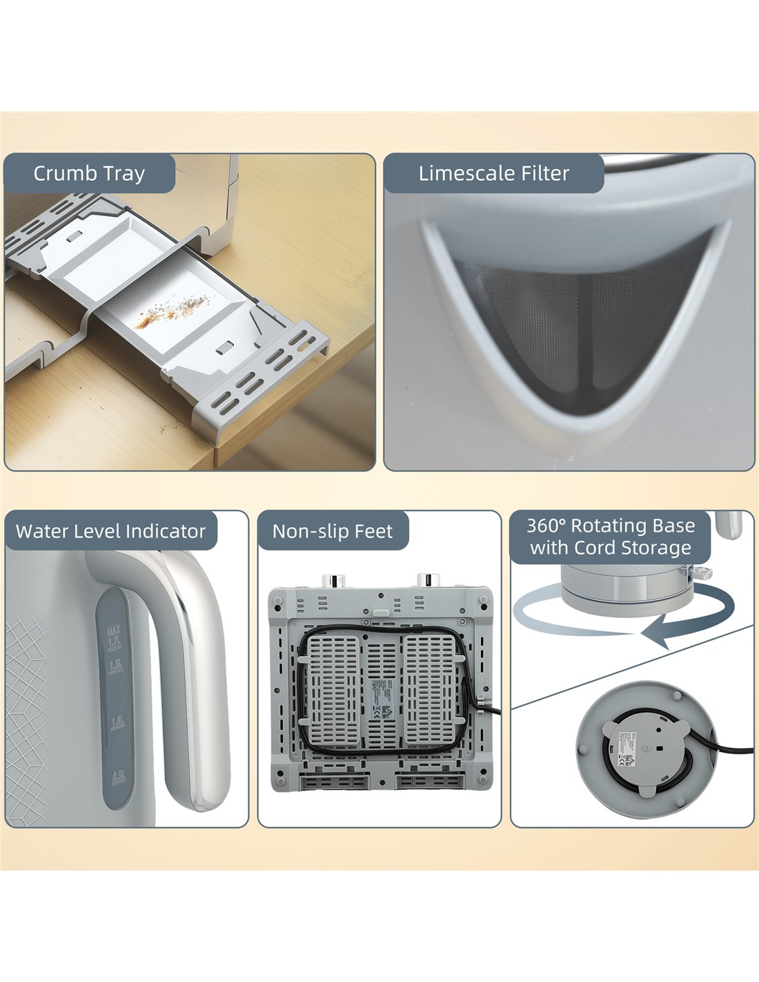 Elevate your kitchen with the HOMCOM Sleek Textured Kettle and Four-Slice Toaster Set in Grey. This coordinated duo presents a distinctive design, blending curved shapes, polished metal accents, and a contemporary matte grey finish with subtle texture. Prepare your breakfast efficiently each morning. The high-performance 3000W kettle, featuring an Otter thermostat, boils 1.7 litres of water swiftly, providing hot drinks without delay. Its auto shut-off and boil-dry protection ensure user safety. The 1860W four-slice toaster includes wide slots and seven adjustable browning levels. Achieve your perfect toast texture with convenient defrost, reheat, and cancel functions. This set delivers modern aesthetics and essential everyday functionality for UK households. Expect swift preparation and dependable operation.