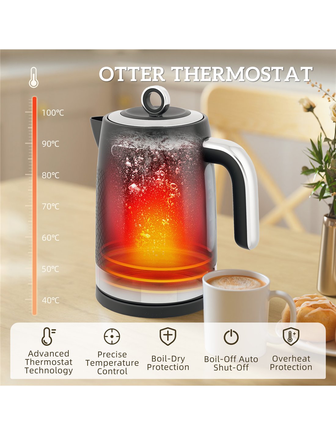- Otter thermostat ensures boil-dry protection, with auto shut-off for safety