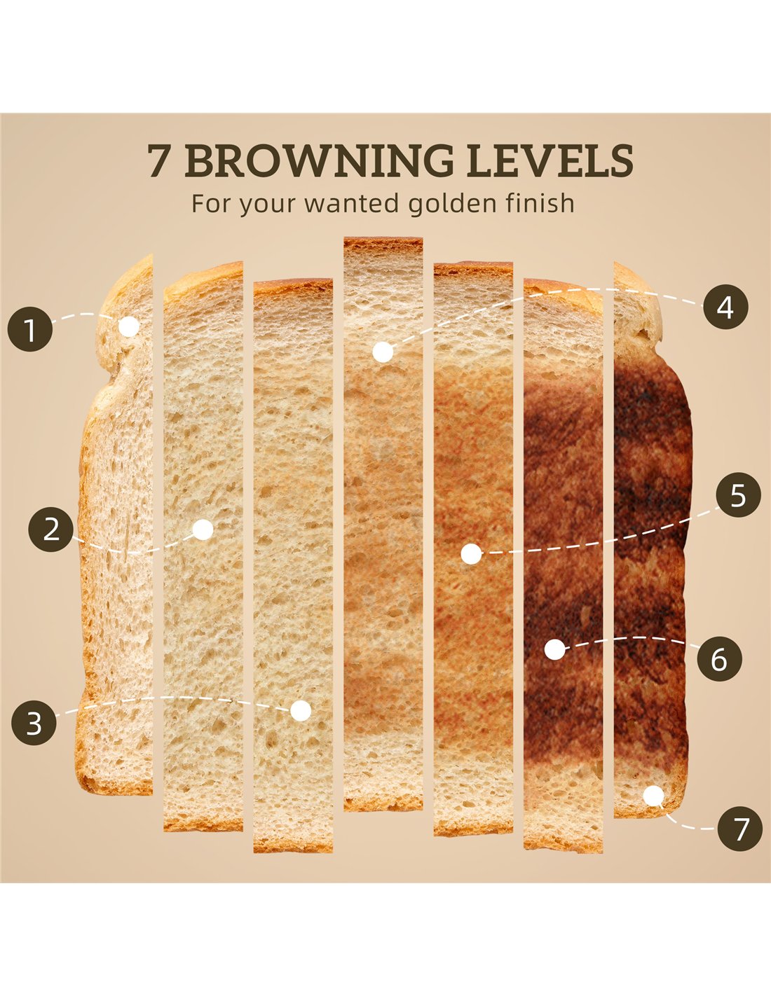 - A: The two-slice toaster offers seven browning levels, alongside defrost, reheat, and cancel functions.