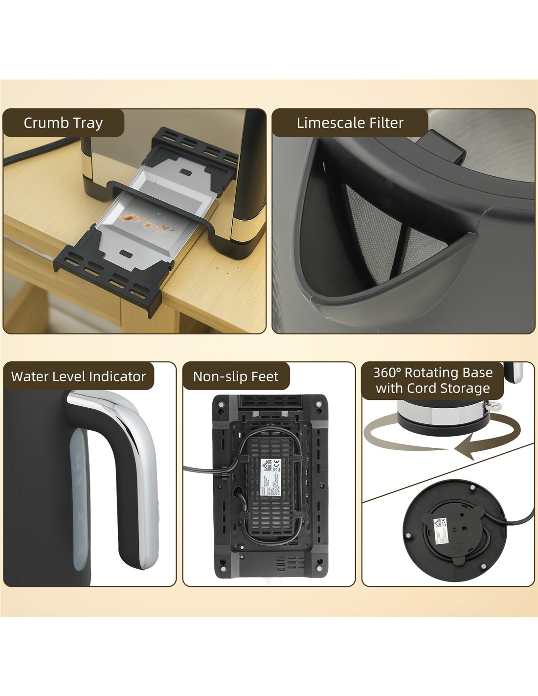 Upgrade your kitchen with the HOMCOM Sleek Textured Kettle and Toaster Set in Black from FastDaddy. This matching matte black set features polished accents and a subtle texture, offering a distinctive look for any modern British home. The powerful 3000W kettle, equipped with a 1.7L capacity, rapidly boils water, serving hot drinks promptly. An Otter thermostat provides boil-dry protection and auto shut-off, ensuring safe operation. Its removable lid simplifies refilling. Complementing the kettle, the 1080W two-slice toaster offers seven browning levels, complete with defrost, reheat, and cancel functions. A removable crumb tray makes cleaning effortless. This set combines rapid performance with a sophisticated design for your daily breakfast routine.