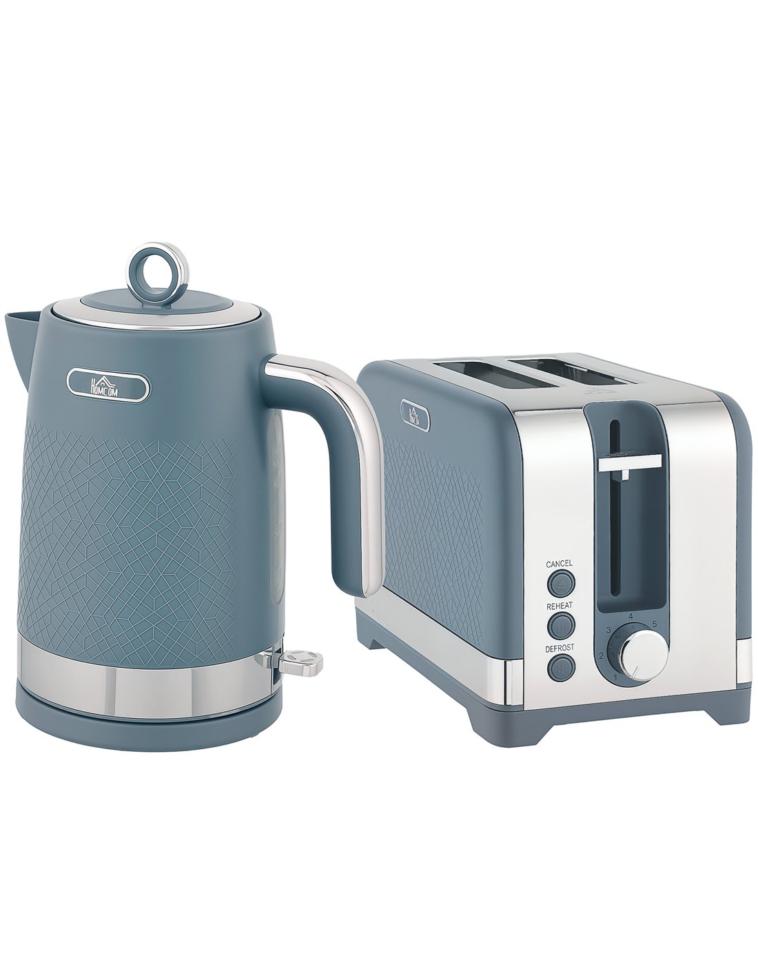 Enhance your daily routine with the HOMCOM Sleek Textured Kettle and Toaster Set in blue. This coordinated kitchen appliance duo provides both modern style and essential functionality. Its design features a curved shape, a matte blue finish, and polished metal accents, creating a distinctive look for any countertop. The 1.7L kettle boils water rapidly, reaching temperature within minutes for your hot drinks. An integrated Otter thermostat ensures safety, offering boil-dry protection and an automatic shut-off feature. The two-slice toaster delivers precise results. Select from seven browning levels to achieve your preferred toast crispness. It includes defrost, reheat, and cancel functions for everyday convenience. Maintain cleanliness effortlessly with the kettle's removable filter and the toaster's pull-out crumb tray. This set combines efficiency and a contemporary aesthetic for your home.