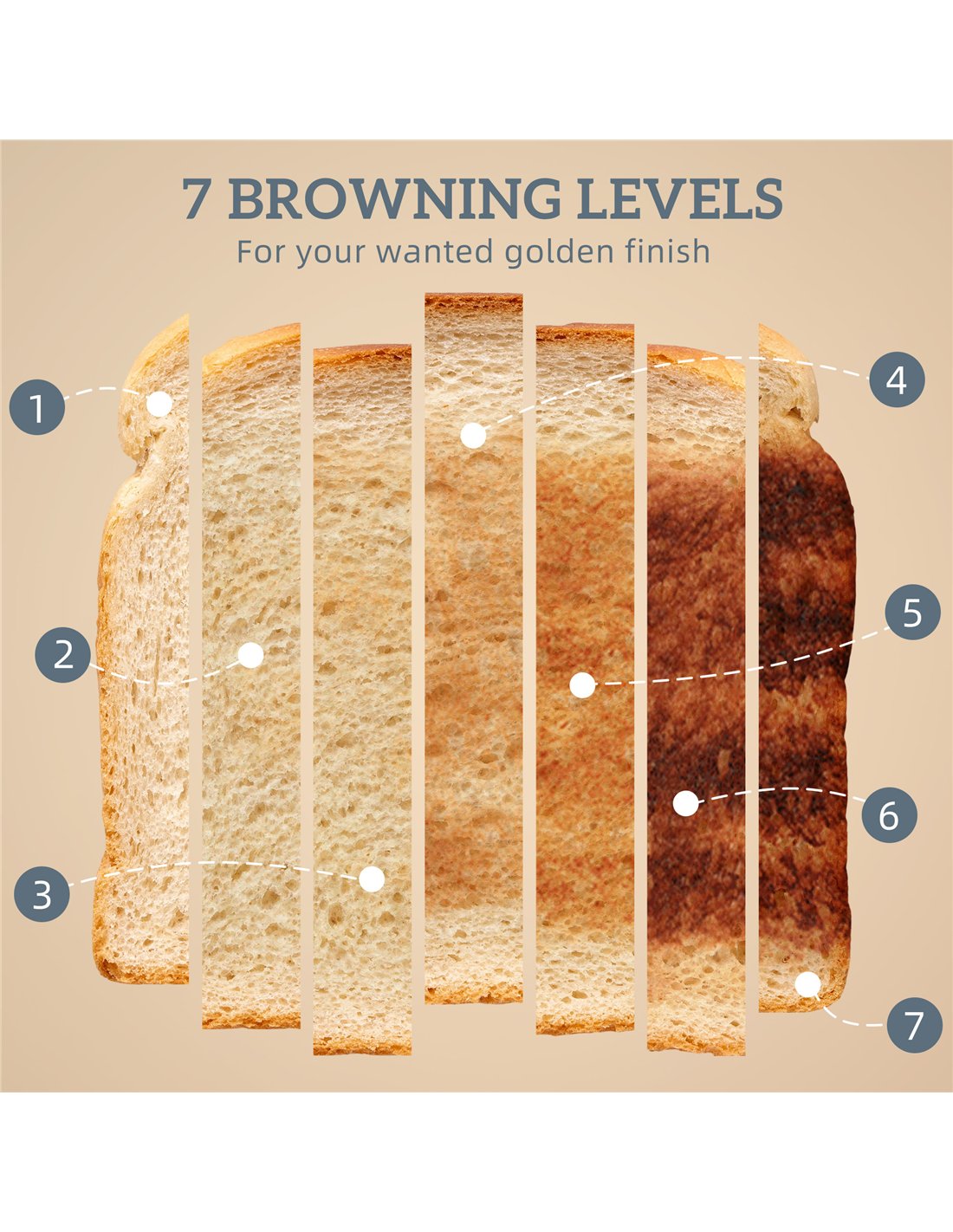 - A: The two-slice toaster offers seven browning levels. It includes defrost, reheat, and cancel functions.
