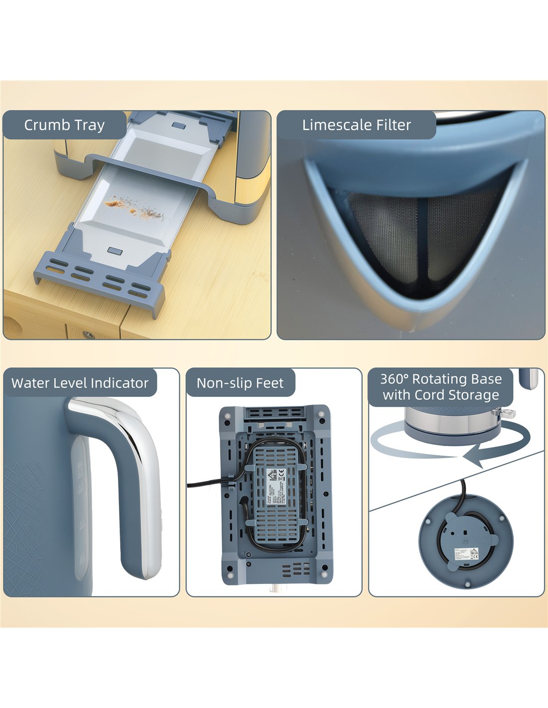 - A: The kettle has a removable filter for cleaning. The toaster features a removable crumb tray for easy maintenance.