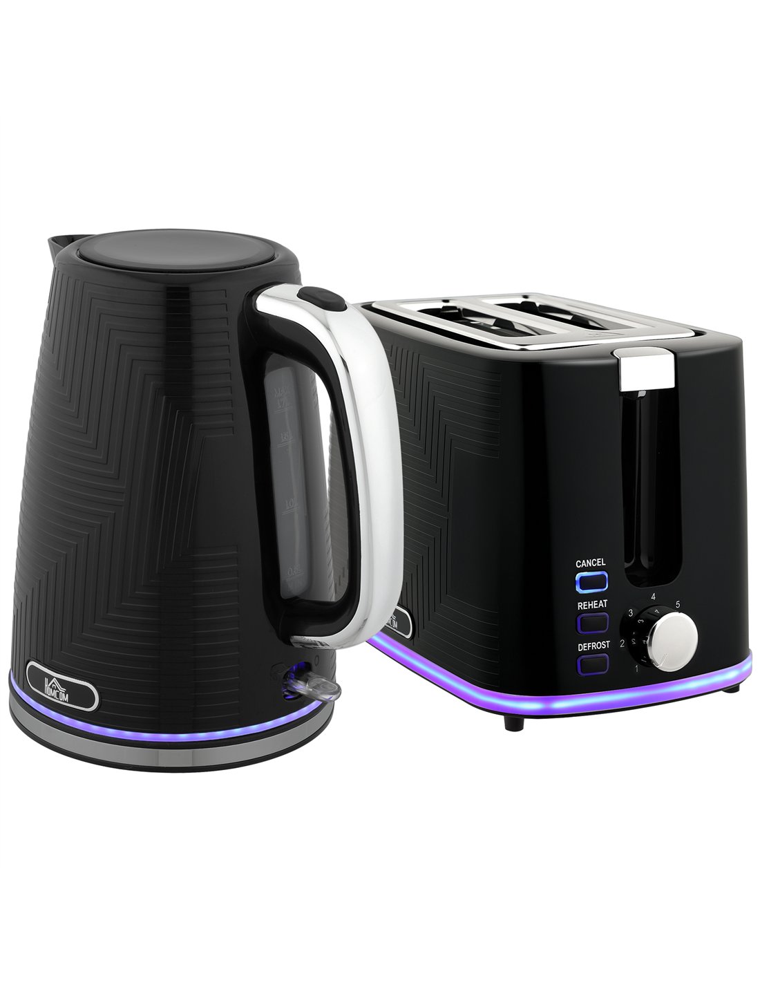Bring style and efficiency to your kitchen with the HOMCOM Modern Kettle and Toaster Set in black. This appliance duo offers a cohesive, sleek design with a textured finish and illuminating lights, enhancing any worktop. The 1.7L kettle provides a generous capacity, boiling water rapidly with 3000W power. It includes essential safety functions such as auto shut-off, boil-dry protection, and overheat prevention, offering complete peace of mind. The accompanying two-slice toaster delivers ideal results with seven browning settings, ensuring perfect toast for your preference every time. A 360° swivel base with cord storage keeps your area neat, and removable components simplify cleaning. This set combines practical performance with a contemporary aesthetic for your home.
