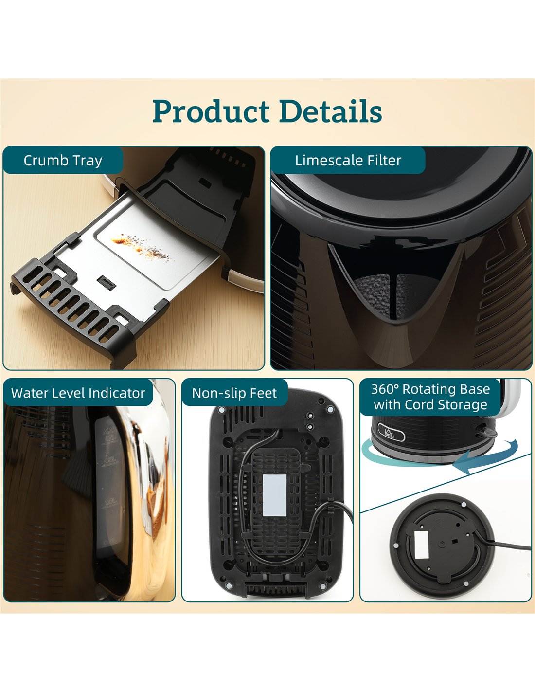- Removable crumb tray and limescale filter for easy cleaning