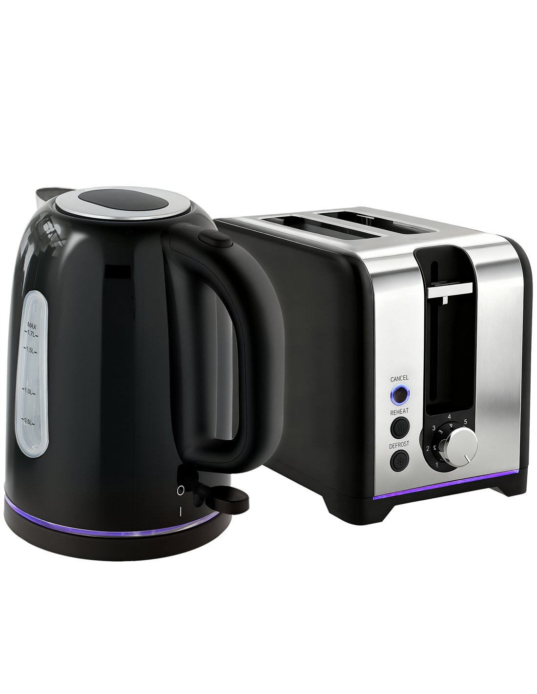 Elevate your kitchen with the HOMCOM Simple Polished Toaster and Kettle Set in black. This stylish duo provides a sleek aesthetic for your countertop, featuring polished metal accents and a simple design. It seamlessly complements existing small appliances. The kettle offers a generous 1.7L capacity, boiling enough water for seven cups. Its 3000W power ensures rapid boiling, while the integrated Otter thermostat guarantees precise temperature control and includes essential safety features like boil-dry protection and auto shut-off. A subtle LED strip illuminates during operation, adding a modern touch. The two-slice toaster features seven browning levels, allowing you to customise your toast precisely. This set combines functionality, safety, and a sophisticated look, making it a practical addition to any UK home from FastDaddy.