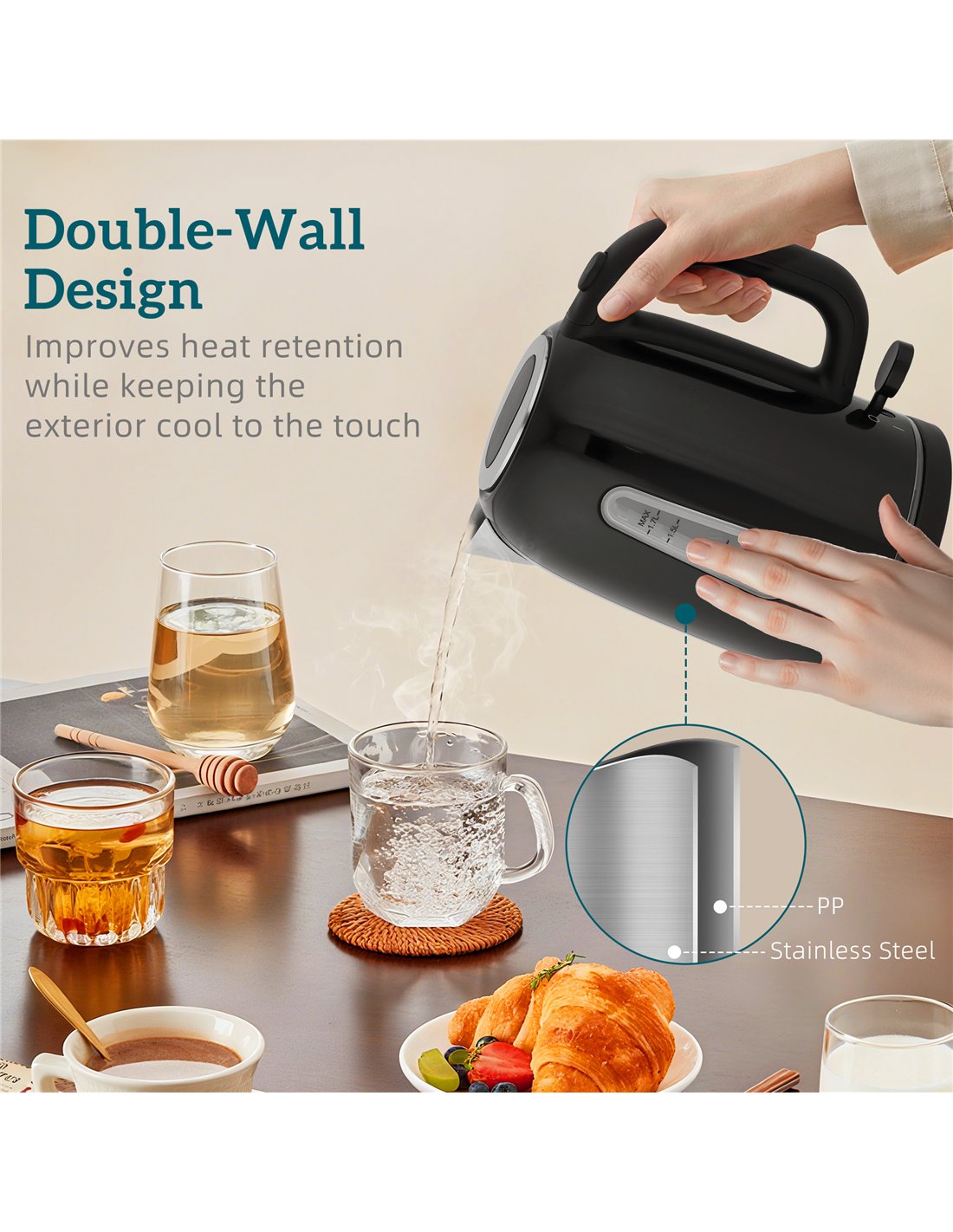 - Otter thermostat for fast boiling, with boil-dry protection and auto shut-off for safety