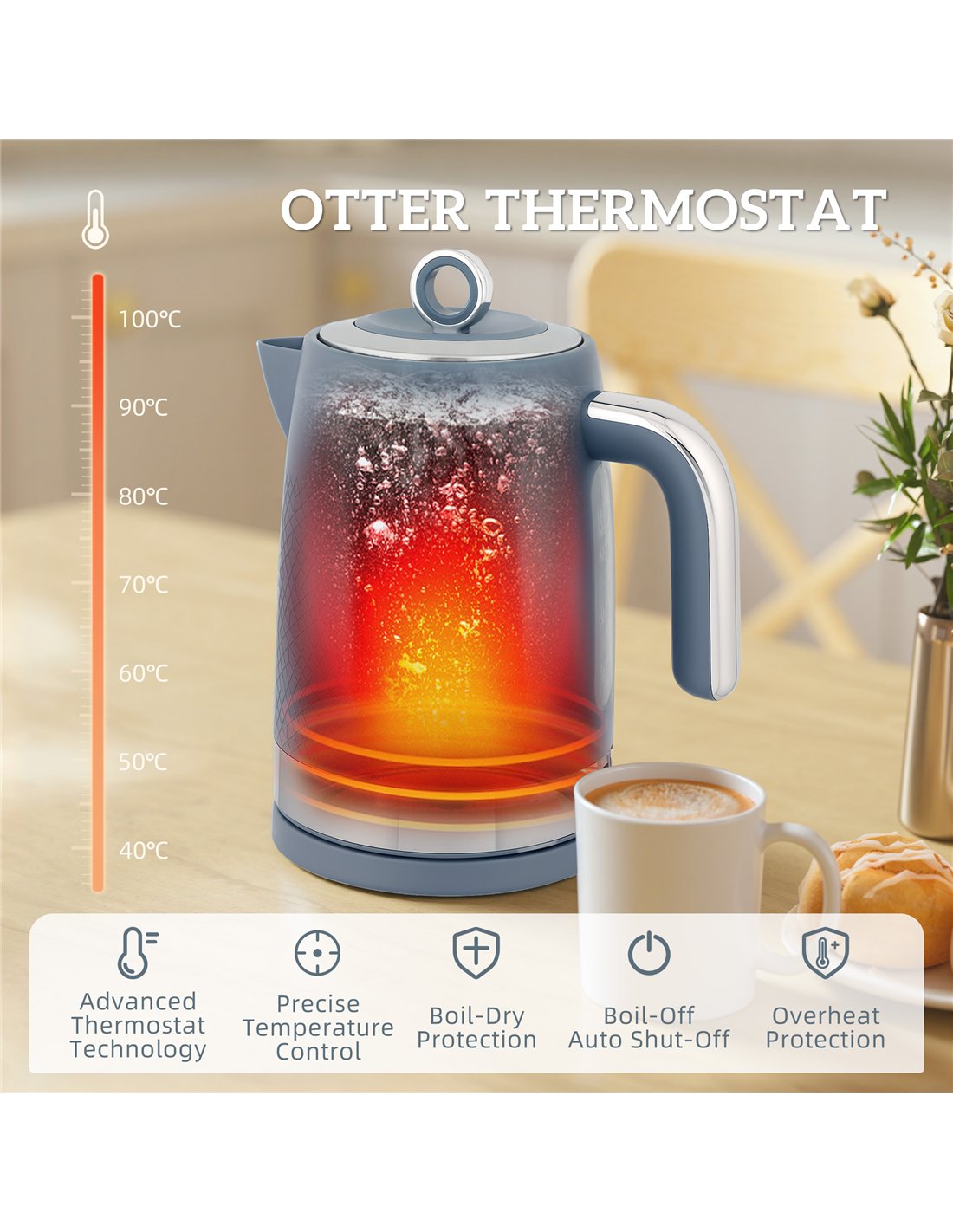 - Otter thermostat ensures boil-dry protection, with auto shut-off for safety
