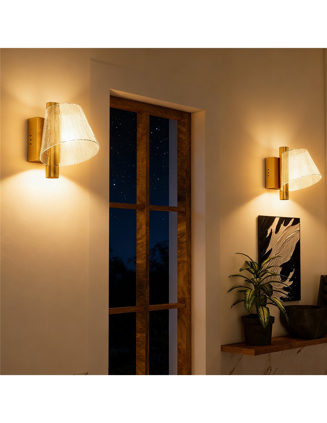 Enhance your home's ambience with the HOMCOM Led Wall Lamp 2 Pack, a modern indoor lighting solution. These 5W wall lights offer a distinctive gold tone finish and feature acrylic shades, etched with vertical lines for a shimmering starry effect. You can adjust your lighting mood precisely with three selectable colour temperatures: 3000K (warm yellow) for relaxation, 4000K (warm white) for versatility, or 6500K (white) for focused activity. Each lamp provides 200 lumens of gentle, high colour rendering (Ra > 80) LED illumination. Designed for various indoor spaces, including bedrooms, living rooms, hallways, and stairs, these wall-mounted lamps seamlessly blend style with practical lighting. Their robust metal and acrylic construction ensures lasting performance. Install these lamps to create a consistent, welcoming atmosphere across your chosen areas.